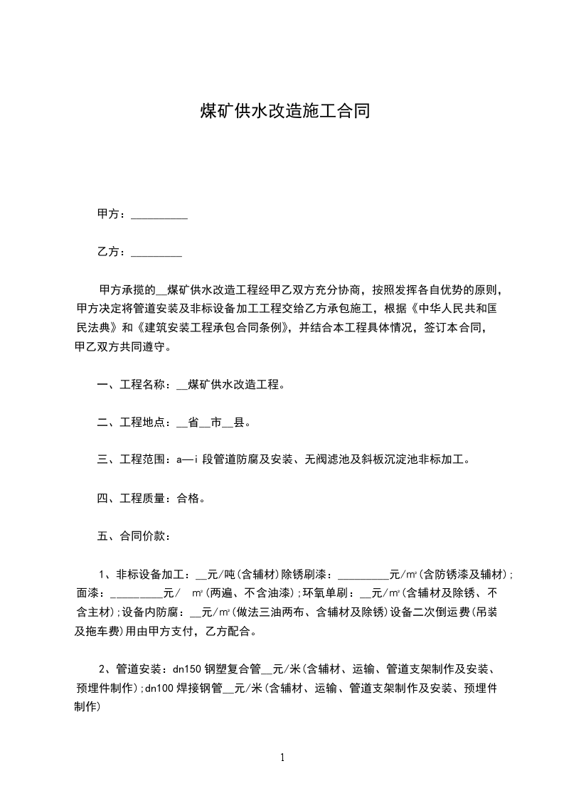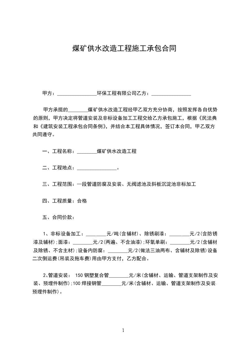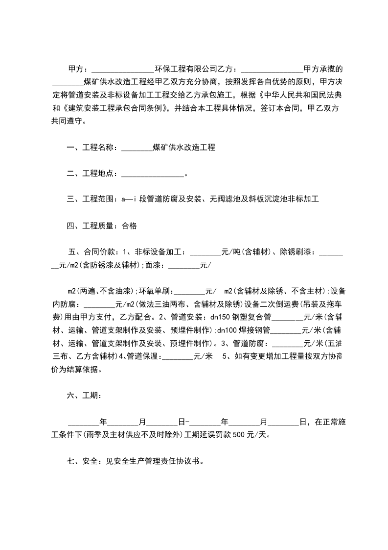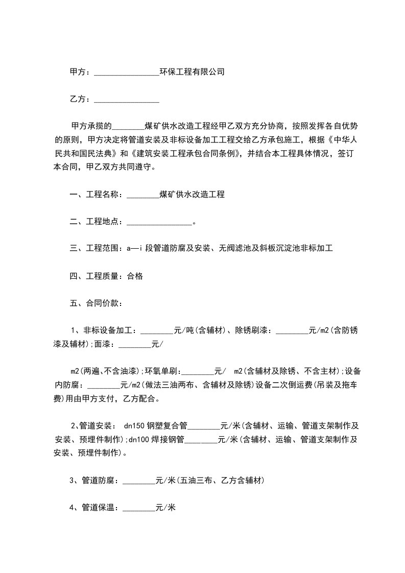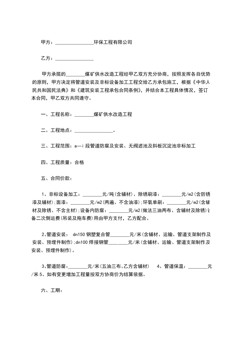 甲方承揽的________煤矿供水改造工程经甲乙双方充分协商,按照发挥各自优势的原则,甲方决定将管道安装及非标设备加工工程交给乙方承包施工,根据《民法典》和《建筑安装工程承包合同条例》,并结合本工程具体情况,签订本合同,甲乙双方共同遵守。