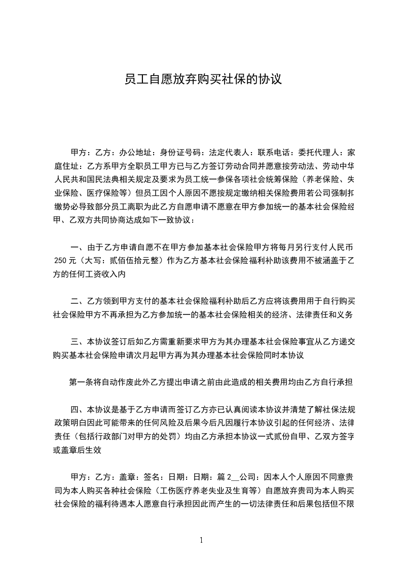 甲方在充分了解到社保的相关规定,清楚其在社保上的权利义务以及不购买社保可能存在的法律风险后,仍然决定不由乙方为其统一购买社会保险。