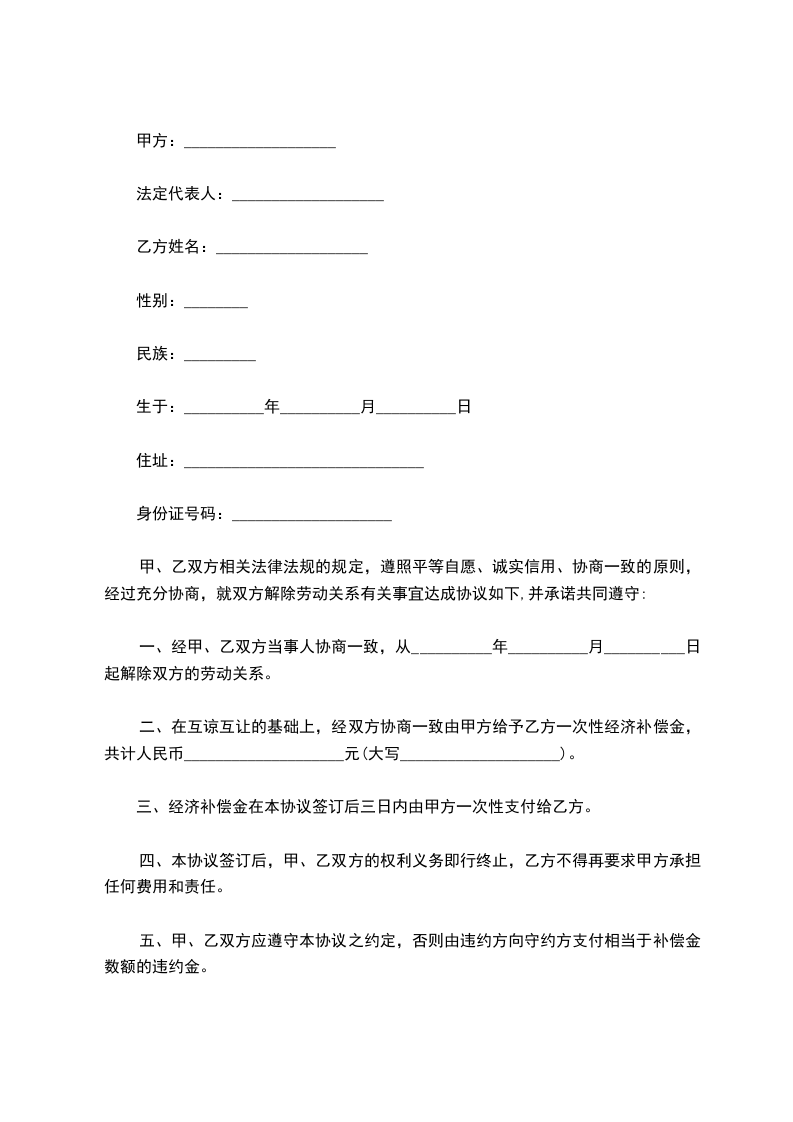 二、在互谅互让的基础上,经双方协商一致由甲方给予乙方一次性经济补偿金,共计人民币____________________元(大写____________________)。