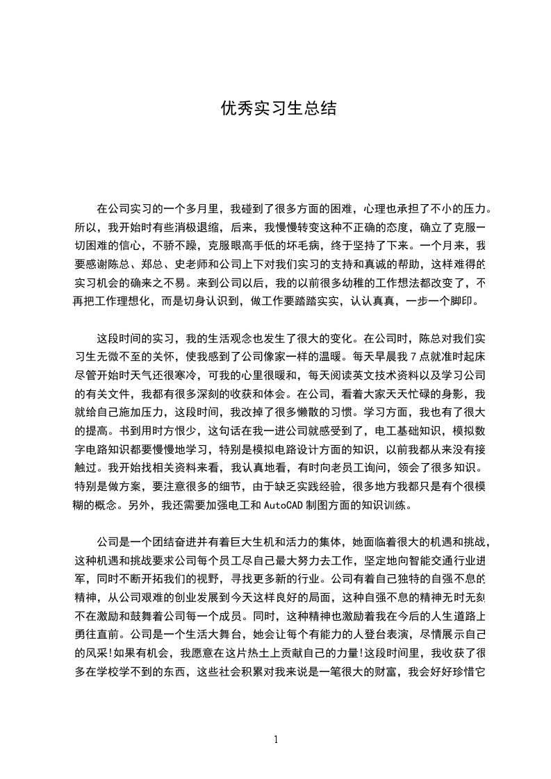 公司是一个团结奋进并有着巨大生机和活力的集体,她面临着很大的机遇和挑战,这种机遇和挑战要求公司每个员工尽自己最大努力去工作,坚定地向智能交通行业进军,同时不断开拓我们的视野,寻找更多新的行业。公司有着自己独特的自强不息的精神,从公司艰难的创业发展到今天这样良好的局面,这种自强不息的精神无时无刻不在激励和鼓舞着公司每一个成员。同时,这种精神也激励着我在今后的人生道路上勇往直前。公司是一个生活大舞台,她会让每个有能力的人登台表演,尽情展示自己的风采!如果有机会,我愿意在这片热土上贡献自己的力量!这段时间里,我收获了很多在学校学不到的东西,这些社会积累对我来说是一笔很大的财富,我会好好珍惜它,利用它!一个多月的实习工作,可以说是顺利成功的。它使我很多方面的能力都能在实践中得到锻炼,对于我今后真正走上工作岗位,有着莫大的帮助!