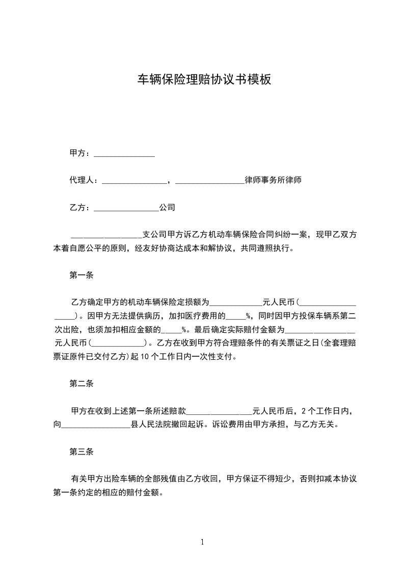 乙方确定甲方的机动车辆保险定损额为_____________元人民币(___________________)。因甲方无法提供病历,加扣医疗费用的_____%,同时因甲方投保车辆系第二次出险,也须加扣相应金额的_____%。最后确定实际赔付金额为_________________元人民币(_____________)。乙方在收到甲方符合理赔条件的有关票证之日(全套理赔票证原件已交付乙方)起10个工作日内一次性支付。