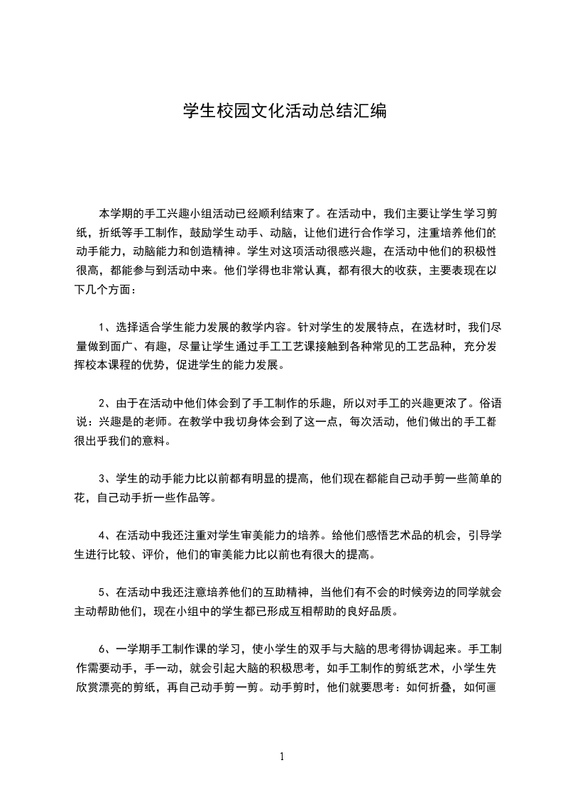 在本学期的手工兴趣小组活动中有收获,也有很多的不足:如有的学生在活动时会不注意卫生,把一些碎纸、废树叶等东西扔到地上;有的学生在活动前不能把活动所需要的东西准备好;还有的学生做手工比较低粗心,做出来的作品质量不高等等。在以后的活动中,我们会更加努力争取把工作做得更好。