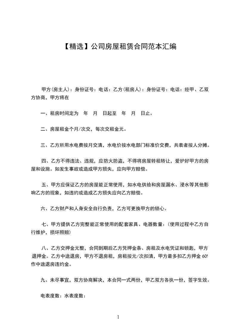 八、乙方交押金元整,合同到期后乙方凭押金条、房租及水电凭证和锁匙,甲方退押金。乙方中途退房,甲方不退房租,房租按元/次扣清,甲方最多扣乙方押金60%作中途退房违约金。