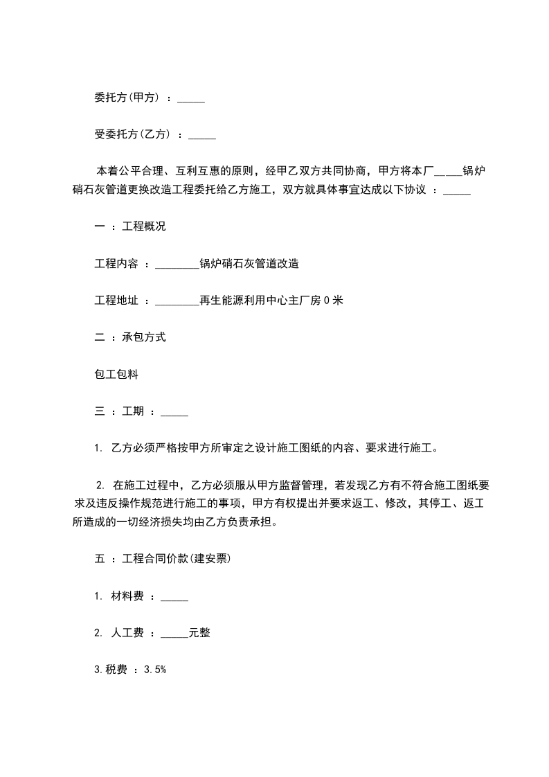 3、乙方自行准备工具、聘请人员,自行负责施工安全,严格按照甲方提供的图纸和甲方要求施工,确保工程质量,如在施工过程中发现质量不合格行为,造成返工,因此造成的管道施工材料损失、人工损失概由乙方自行承担;