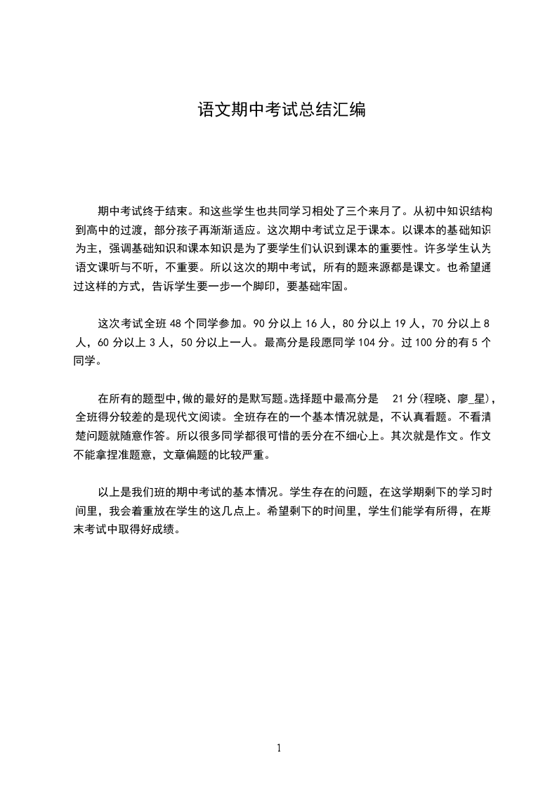 以上是我们班的期中考试的基本情况。学生存在的问题,在这学期剩下的学习时间里,我会着重放在学生的这几点上。希望剩下的时间里,学生们能学有所得,在期末考试中取得好成绩。