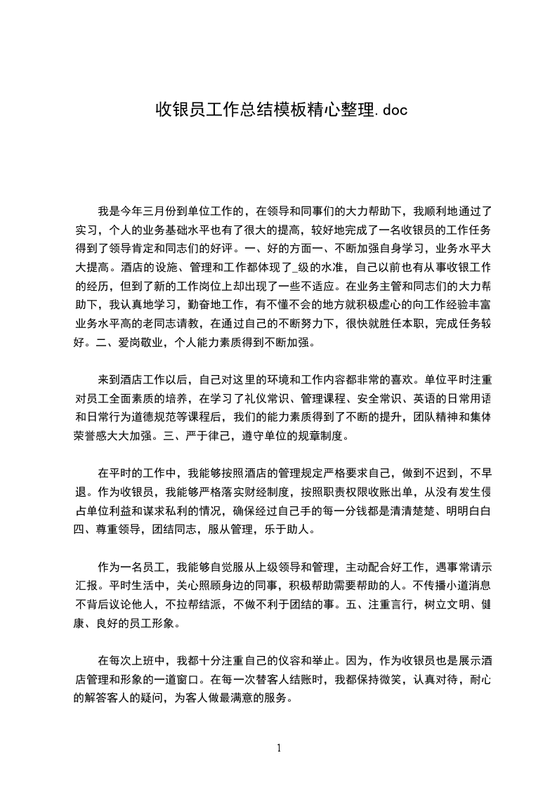 我是今年三月份到单位工作的,在领导和同事们的大力帮助下,我顺利地通过了实习,个人的业务基础水平也有了很大的提高,较好地完成了一名收银员的工作任务,得到了领导肯定和同志们的好评。一、好的方面一、不断加强自身学习,业务水平大大提高。酒店的设施、管理和工作都体现了_级的水准,自己以前也有从事收银工作的经历,但到了新的工作岗位上却出现了一些不适应。在业务主管和同志们的大力帮助下,我认真地学习,勤奋地工作,有不懂不会的地方就积极虚心的向工作经验丰富、业务水平高的老同志请教,在通过自己的不断努力下,很快就胜任本职,完成任务较好。二、爱岗敬业,个人能力素质得到不断加强。