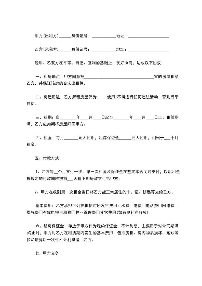 一、租房地点:甲方同意把__________________________________室的房屋租给乙方,并保证该房的合法出租性。