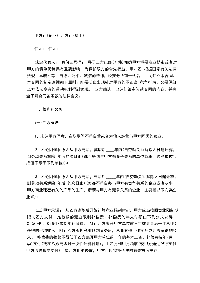 (二)甲方承诺: 从乙方离职后开始计算竞业限制时起,甲方应当按照竞业限制期限向乙方支付一定数额的竞业限制补偿费。补偿费的年支付额由下列公式求得: C=(AI-PI) C:竞业限制年补偿费; AI:乙方离开甲方单位前三年或者最后一年从甲方获得的平均收入; PI:乙方承担竞业限制义务后,从事其他工作实际或能够获得的收入。 补偿费的数额不得低于乙方离开甲方单位前一年的基本工资。补偿费按年(月、季)支付(或在乙方离职时一次性计算付清),由乙方到甲方领取(或甲方通过银行支付、甲方通过邮局支付)。如乙方拒绝领取,甲方可以将补偿费向有关方面提存。