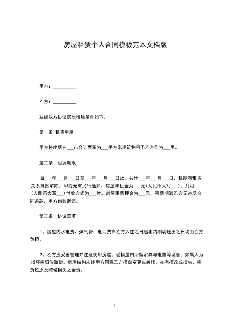 自___年___月___日至___年___月___日止,共计___年___月___日,租期满租赁关系自然解除,甲方无需另行通知。房屋年租金为___元(人民币大写___),月租___(人民币大写___)付款方式为___付。房屋租赁押金为___元,租赁期满乙方无违反合同条款,甲方如数退还。
