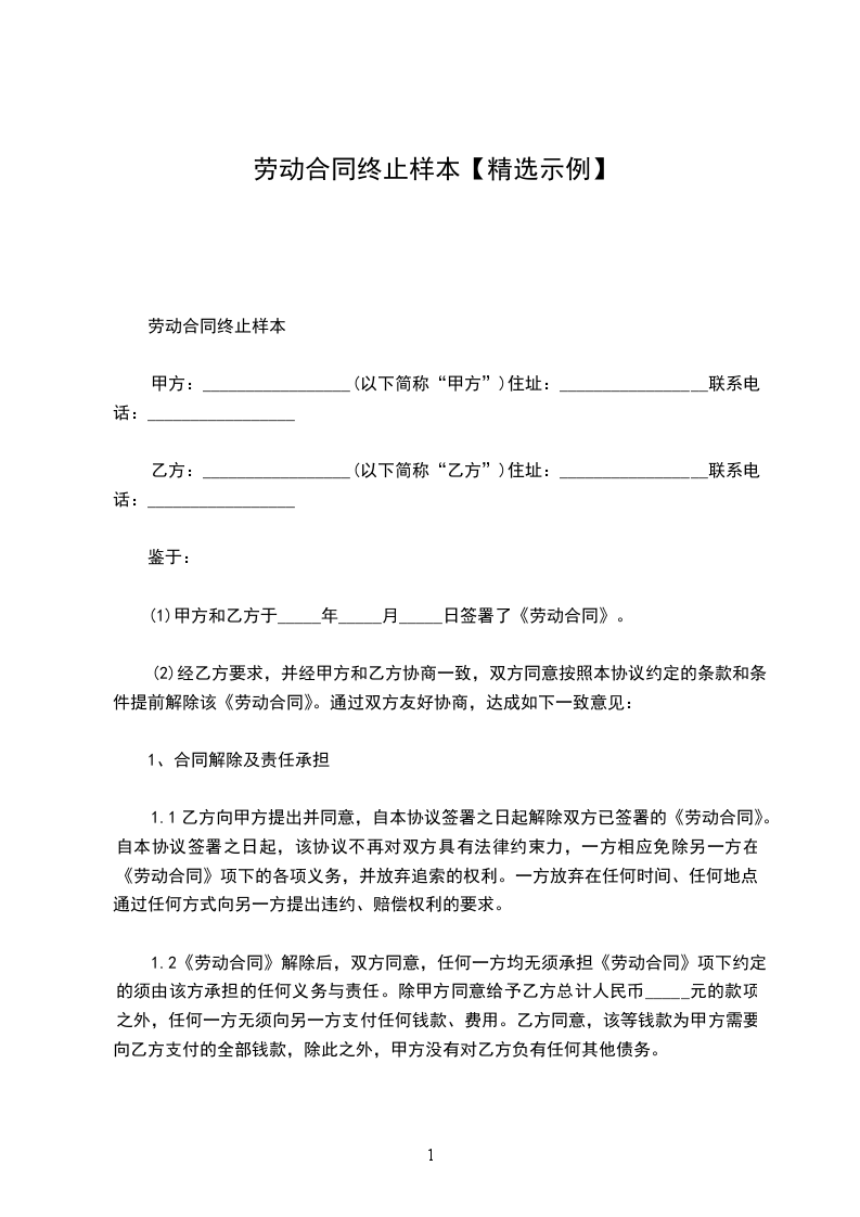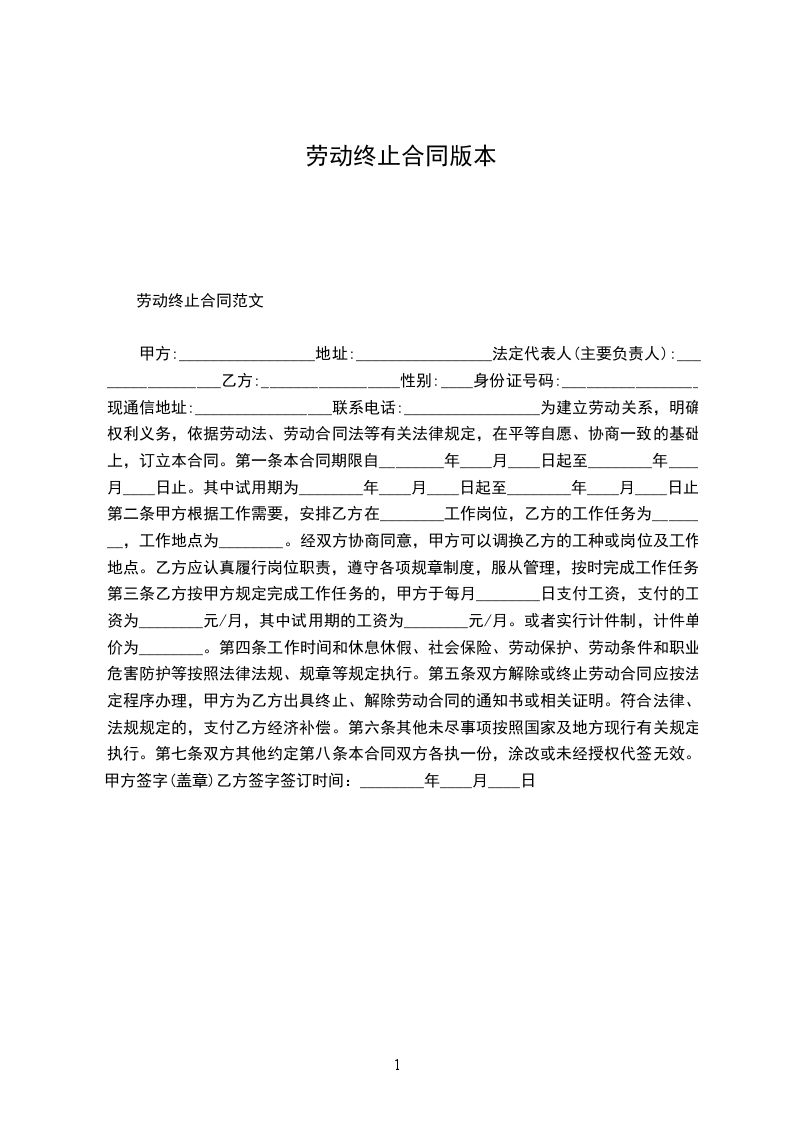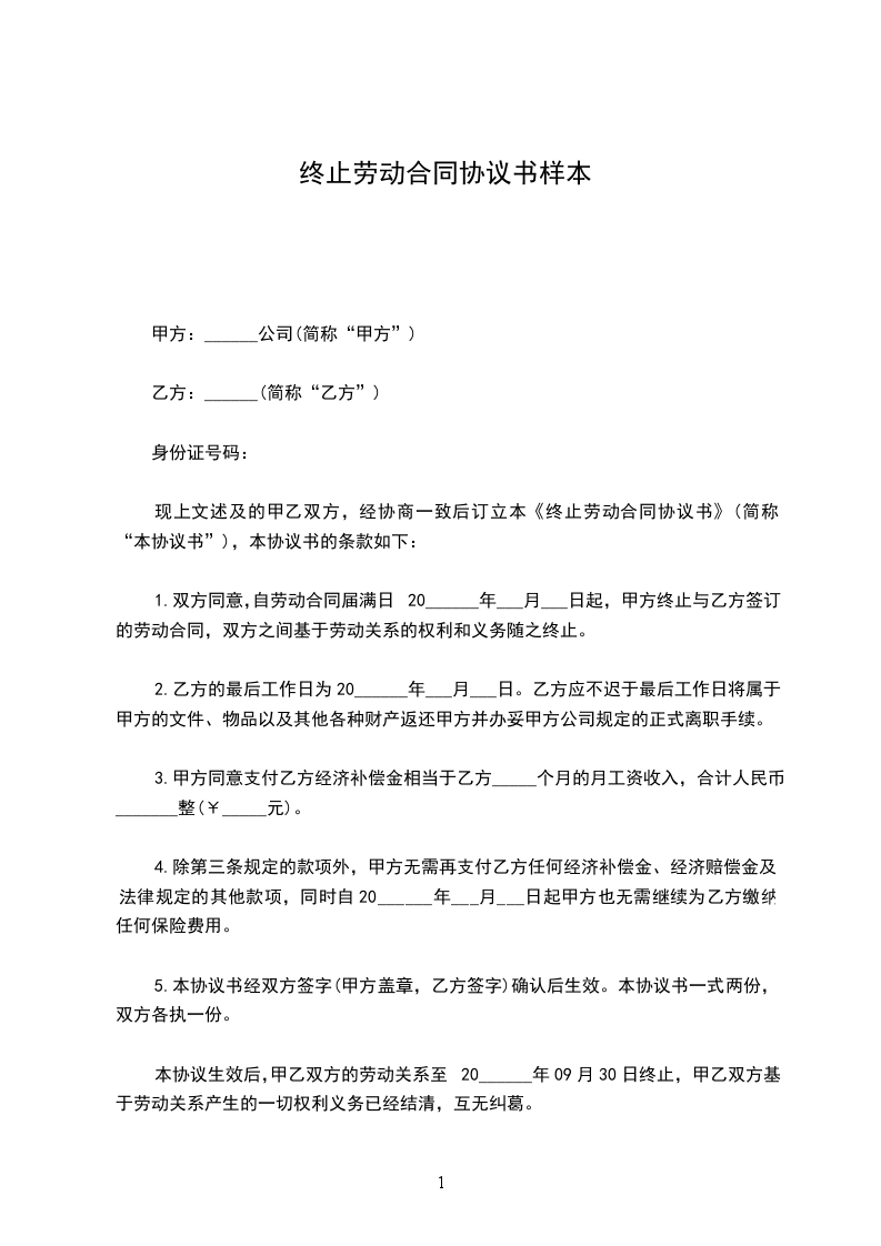 1、自_____________年__________月__________日起,解除双方签订的劳动合同,双方的权利义务随之终止;