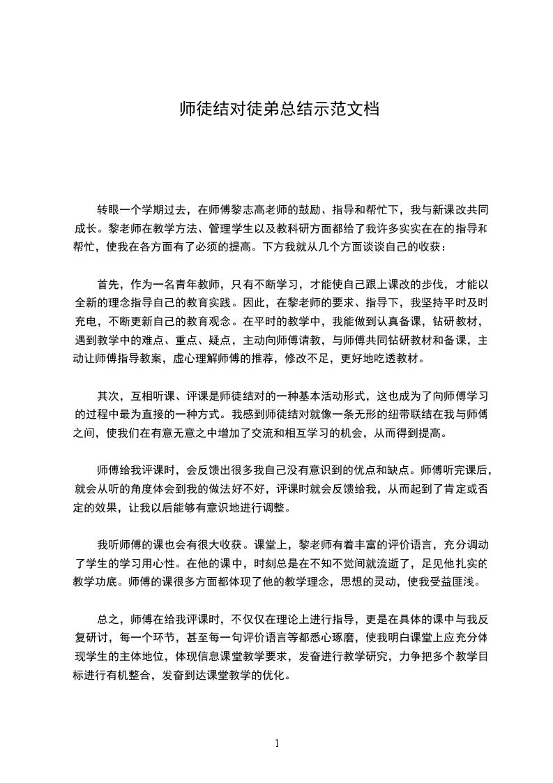 学校组织的“师徒结对”活动,使我受益匪浅,我感谢学校为我带给了这样的机会。作为青年教师的我,更深知自己的职责重大,只有虚心的向师傅学习,才能不断地提高自身的素质。总之,在这半年来,我向黎老师学到了很多东西。我也将不断学习,不断提高,向更高的目标迈进,向专业型教师发展,这是我的又一目标。