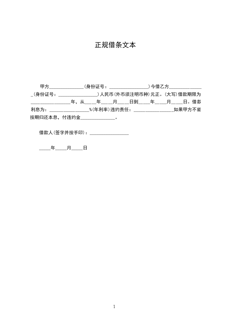 甲方_______________(身份证号:_________________)今借乙方_______________(身份证号:_________________)人民币(外币须注明币种)元正。(大写)借款期限为:_________________年,从_____年_____月_____日到_____年_____月_____日。借款利息为:_________________%(年利率)违约责任:_________________如果甲方不能按期归还本息,付违约金_______________。