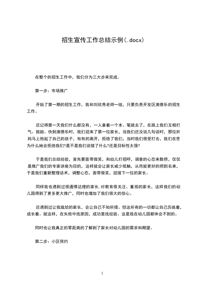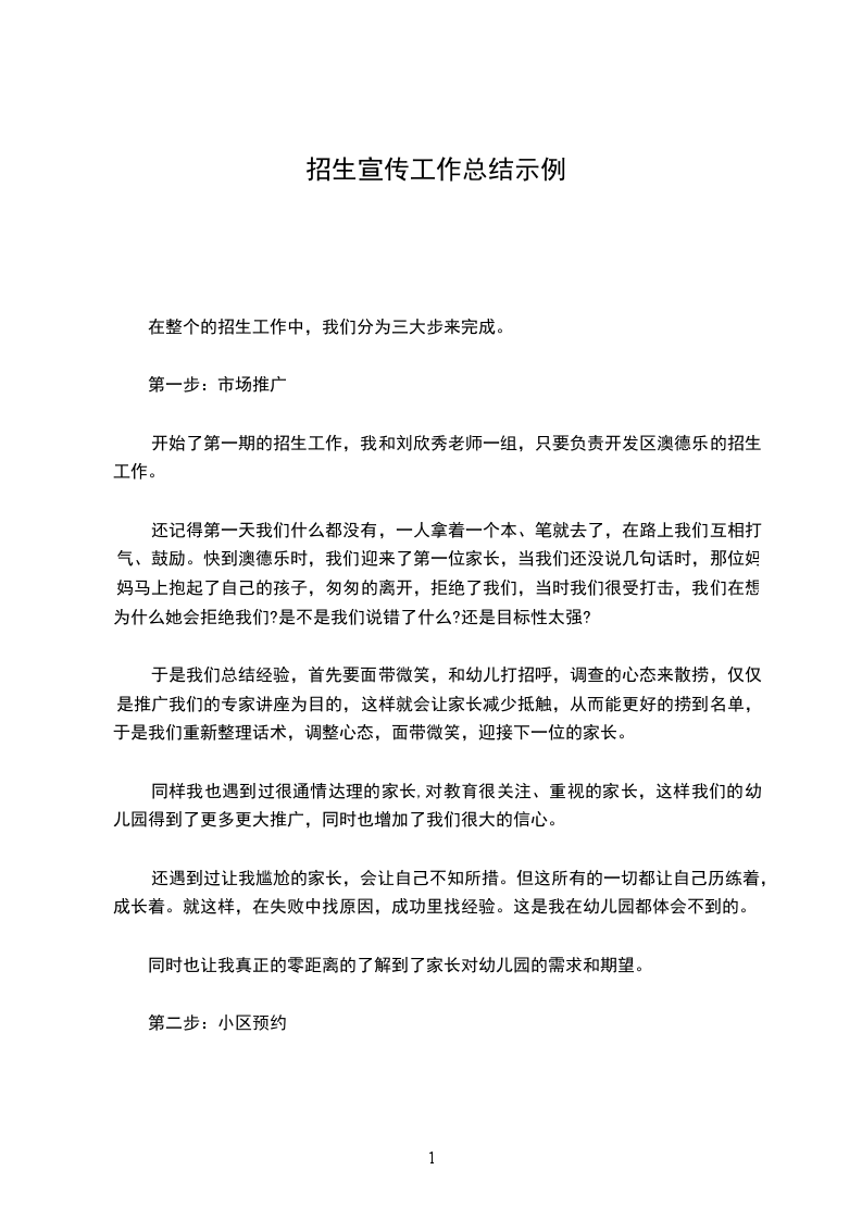 小区推广预约没有我想象的那么简单,因为家长会停下来和你细细的沟通、交流,例如说教学、特色,开始我会很茫然,因为对幼儿园的不了解,但是通过王志敏老师和赵_飞老师的帮助,也有了自信和家长沟通。
