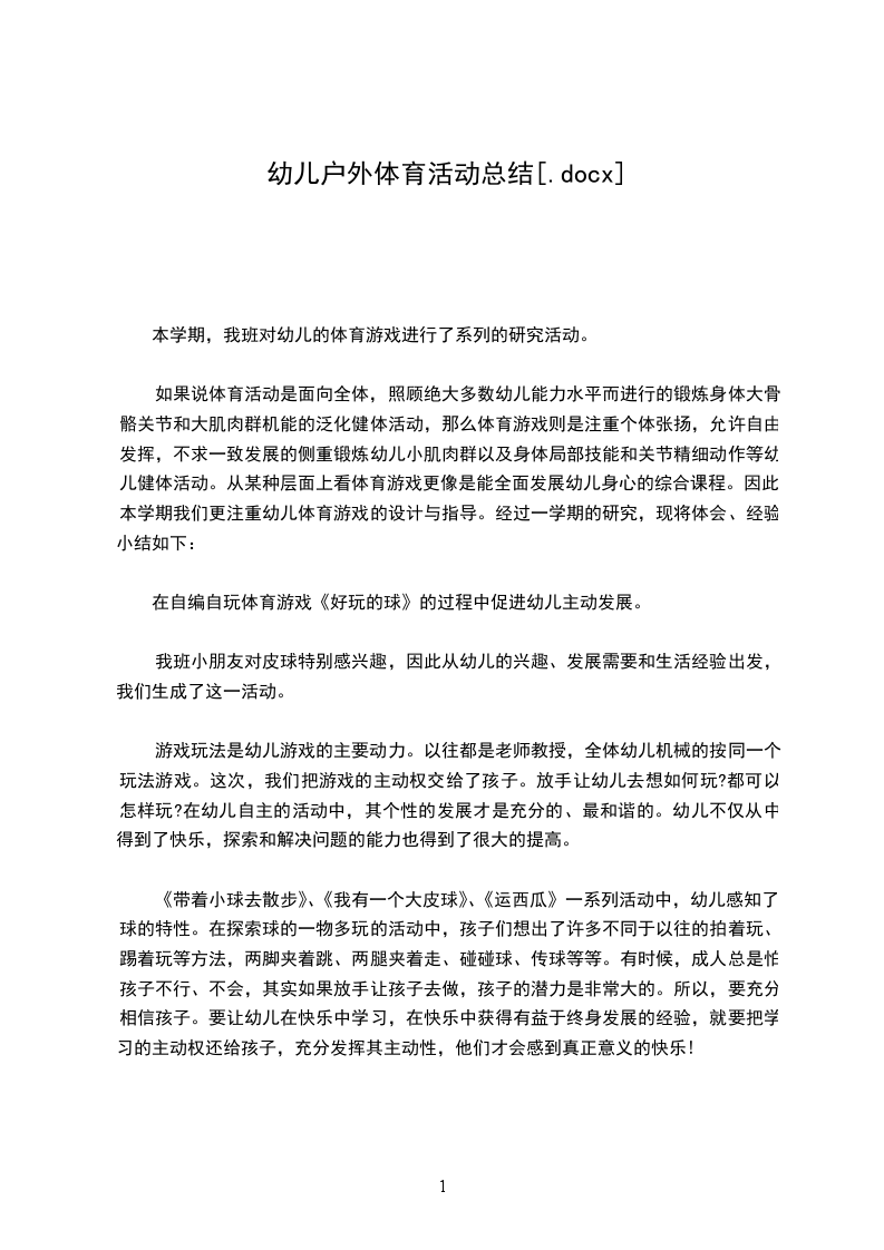 如果说体育活动是面向全体,照顾绝大多数幼儿能力水平而进行的锻炼身体大骨骼关节和大肌肉群机能的泛化健体活动,那么体育游戏则是注重个体张扬,允许自由发挥,不求一致发展的侧重锻炼幼儿小肌肉群以及身体局部技能和关节精细动作等幼儿健体活动。从某种层面上看体育游戏更像是能全面发展幼儿身心的综合课程。因此,本学期我们更注重幼儿体育游戏的设计与指导。经过一学期的研究,现将体会、经验小结如下: