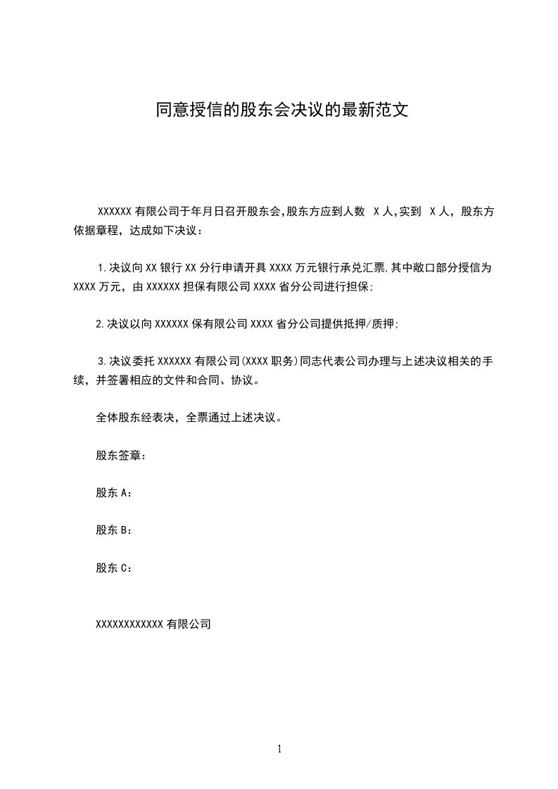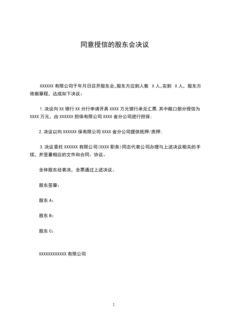1.决议向XX银行XX分行申请开具XXXX万元银行承兑汇票,其中敞口部分授信为XXXX万元,由XXXXXX担保有限公司XXXX省分公司进行担保;