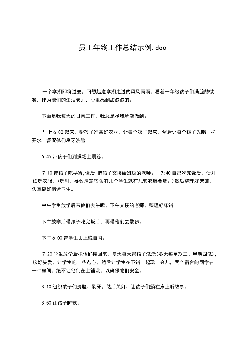 这就是我一天的工作,在平时的工作中,我注重关心孩子们的健康成长,做到适时开窗换气,保证宿舍既暖和又留有新鲜空气,特别是注意关照一些特殊的孩子(如我宿舍的一个同学不小心手骨折了)。在工作中,对他们要多一份关爱,当发现他们有特殊情况时,就要尽量帮助他们。如某同学开学初不敢一个人睡,我就连着好几天陪着他睡。