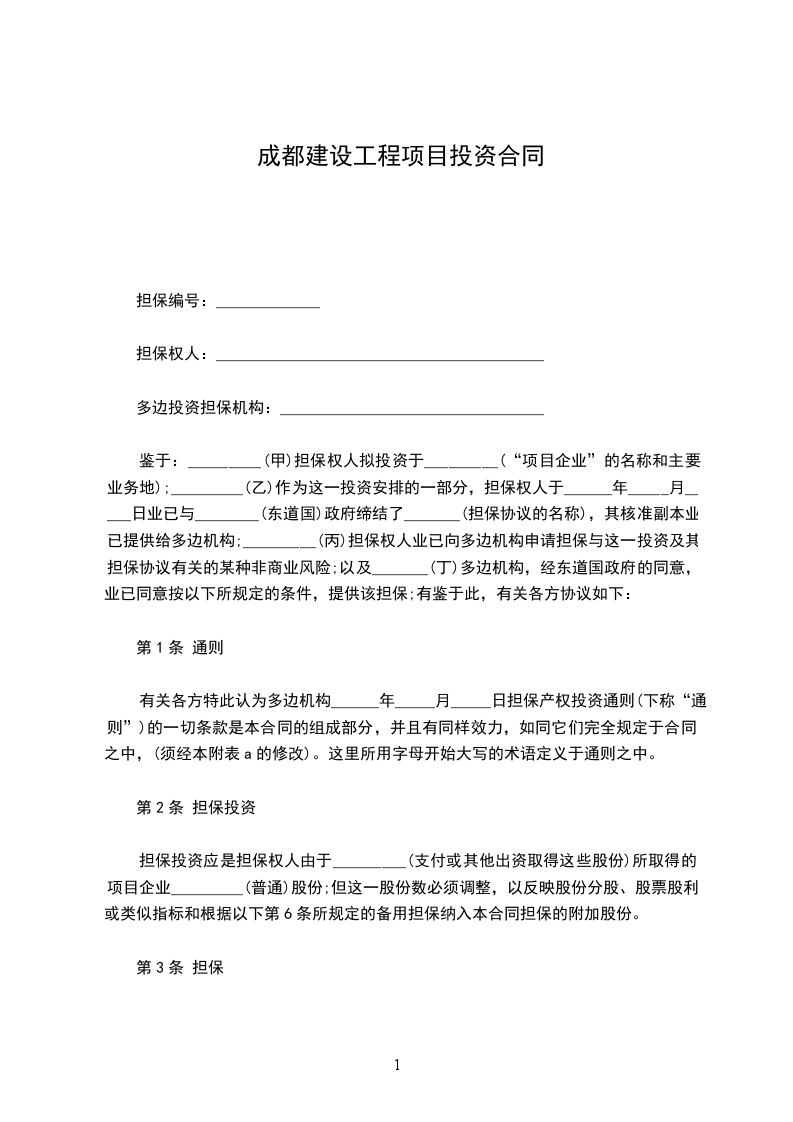 鉴于:_________(甲)担保权人拟投资于_________(“项目企业”的名称和主要业务地);_________(乙)作为这一投资安排的一部分,担保权人于______年_____月_____日业已与________(东道国)政府缔结了_______(担保协议的名称),其核准副本业已提供给多边机构;_________(丙)担保权人业已向多边机构申请担保与这一投资及其担保协议有关的某种非商业风险;以及_______(丁)多边机构,经东道国政府的同意,业已同意按以下所规定的条件,提供该担保;有鉴于此,有关各方协议如下: