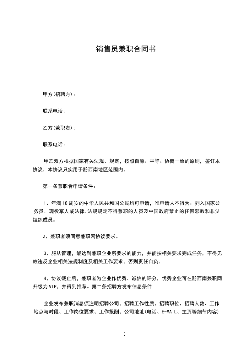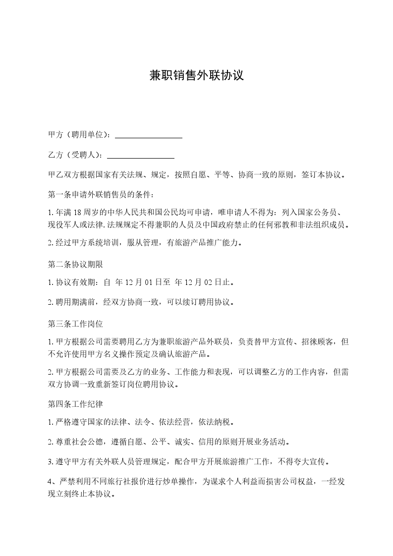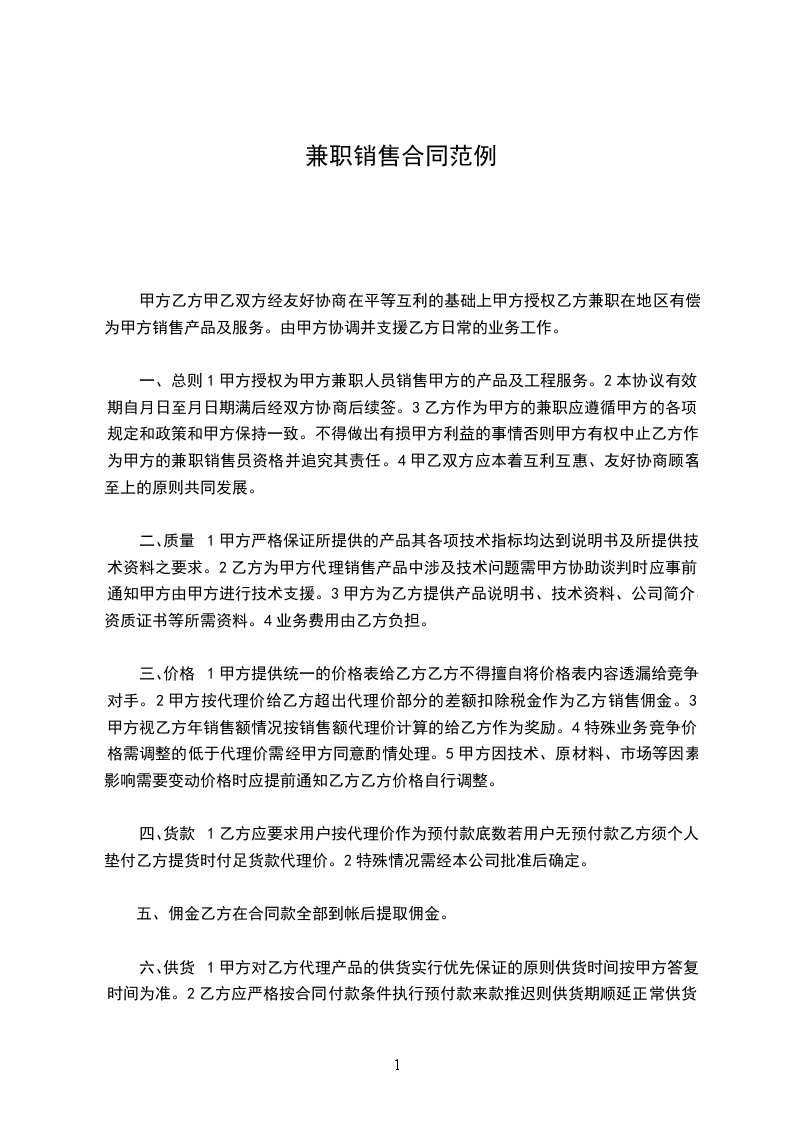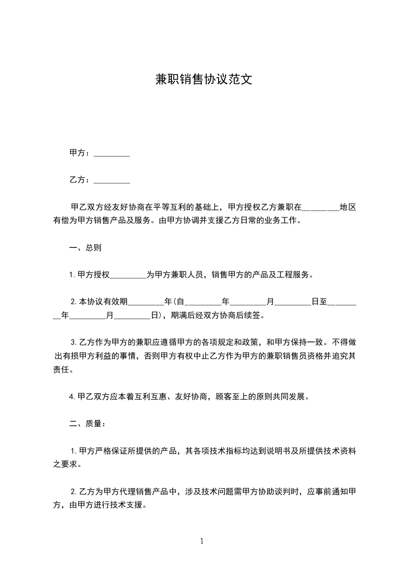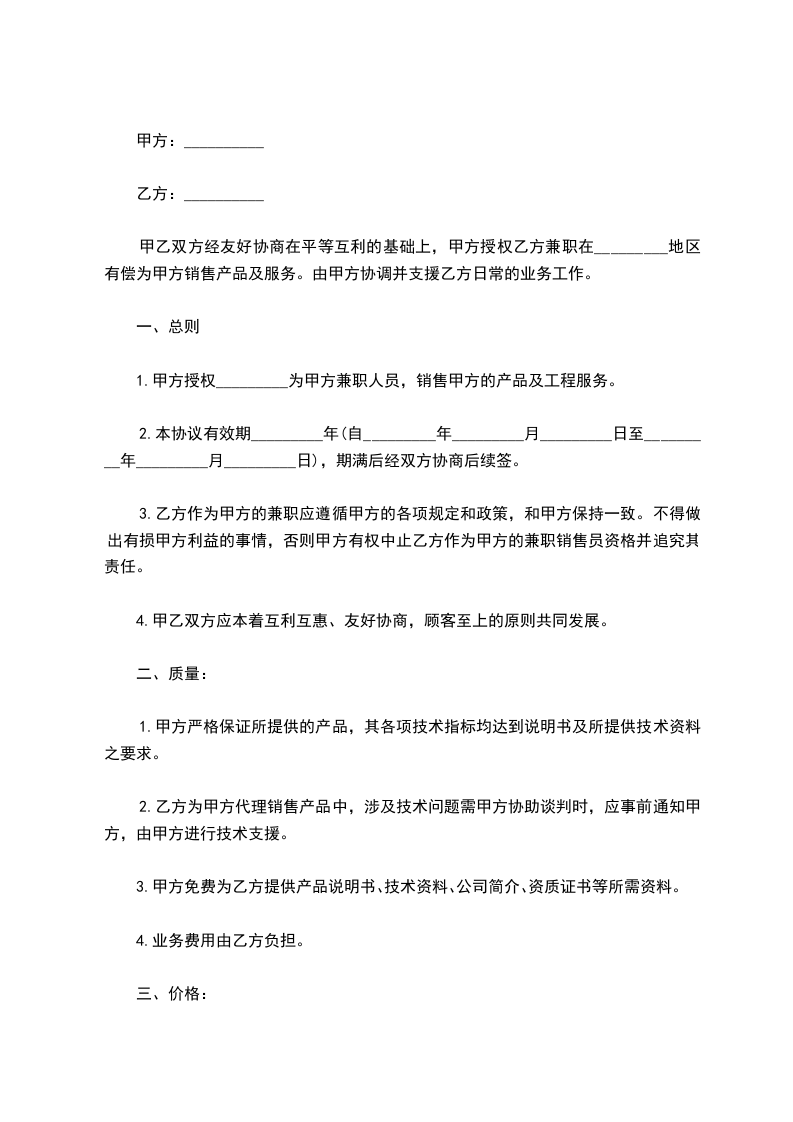 甲乙双方经友好协商在平等互利的基础上,甲方授权乙方兼职在_________地区有偿为甲方销售产品及服务。由甲方协调并支援乙方日常的业务工作。