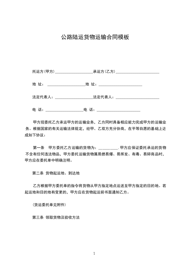 第一条 甲方委托乙方运输的货物为:__________.甲方应保证委托承运的货物不含有任何违法物品,甲方委托运输货物属易燃易爆、易挥发、有毒、易碎商品时,甲方应在委托单中明确注明。