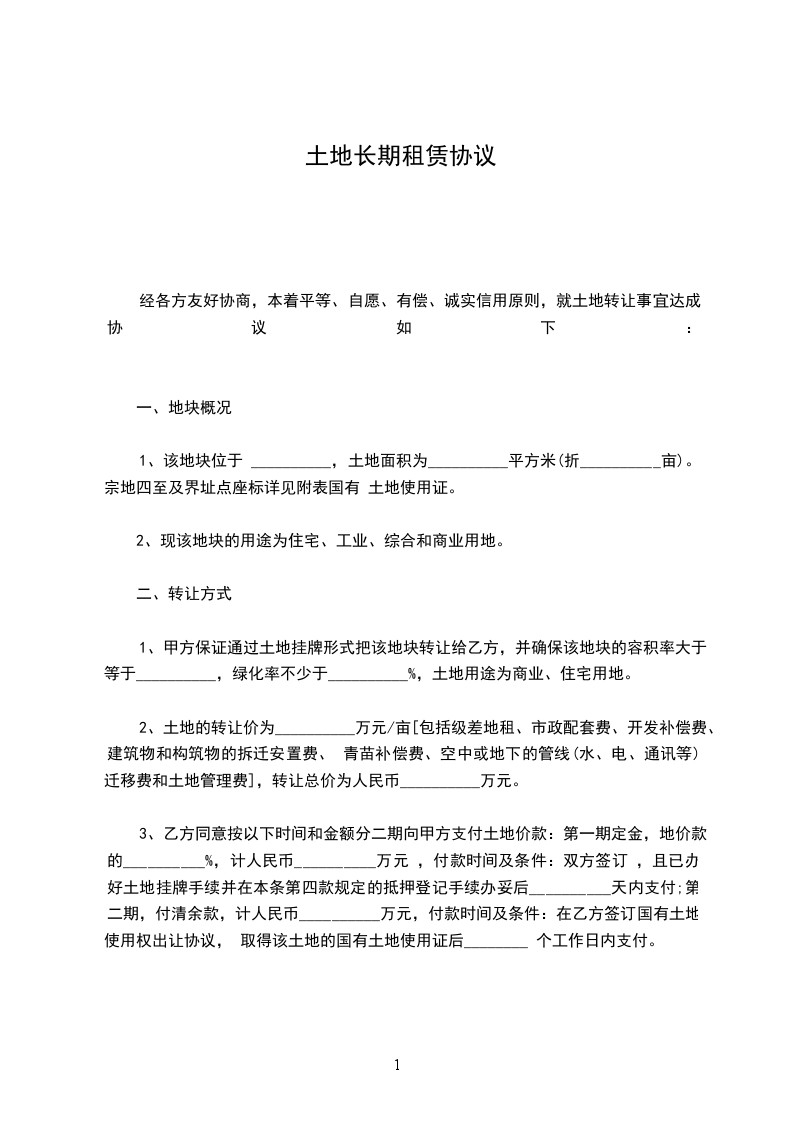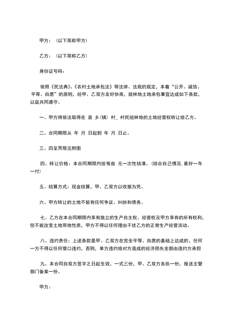 一、甲方将___________的___________亩左右个人承包土地转包给乙方,乙方对该土地只有使用权,不得买卖、荒芜,不准转作宅基地和构筑其它建设物。