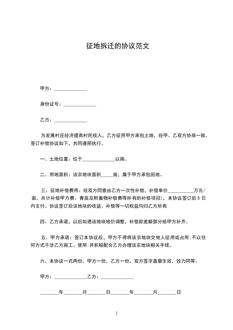 三、征地补偿费用:经双方同意由乙方一次性补偿,补偿单价___________万元/亩,共计补偿甲方费、青苗及附着物补偿费等所有的补偿项目),本协议签订后5日内支付。协议签订后该地块的收益、补偿等一切权益均归乙方所有