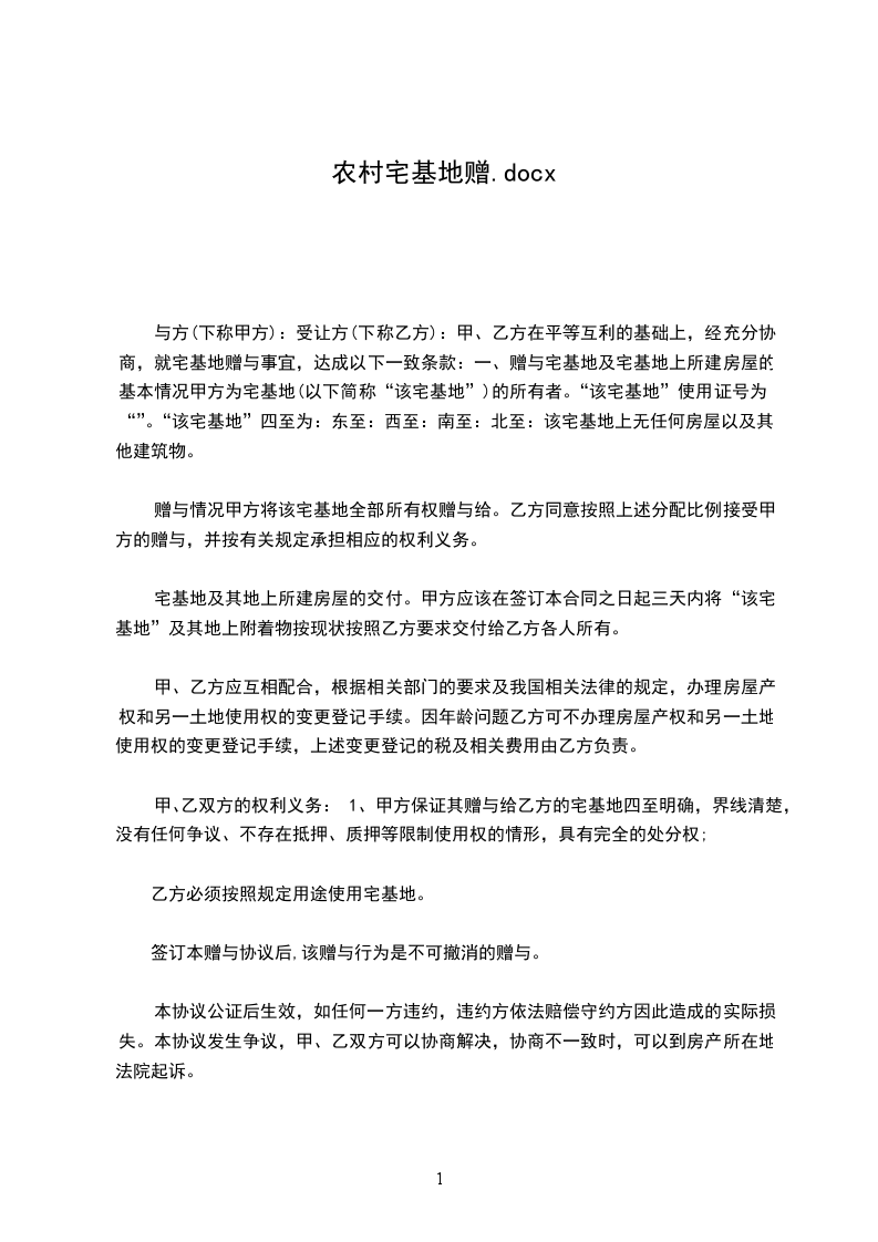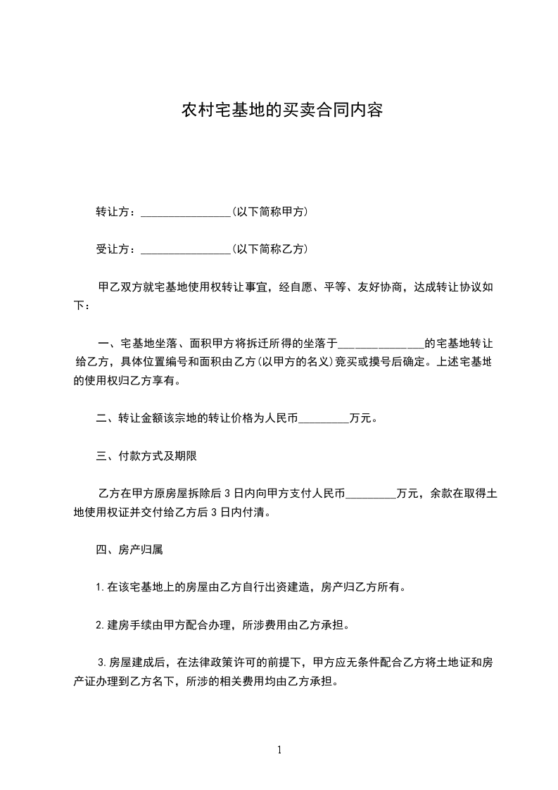 一、宅基地坐落、面积甲方将拆迁所得的坐落于_______________的宅基地转让给乙方,具体位置编号和面积由乙方(以甲方的名义)竞买或摸号后确定。上述宅基地的使用权归乙方享有。