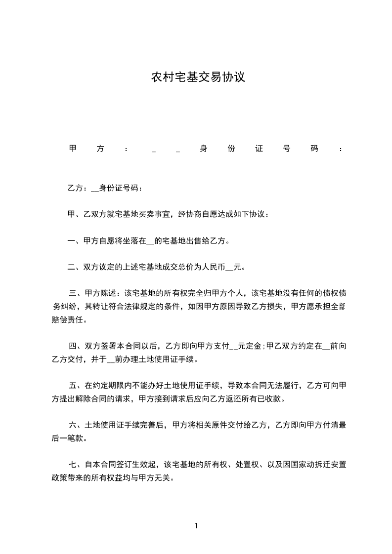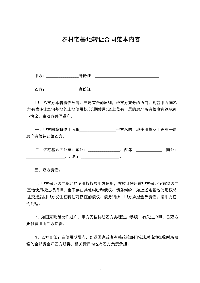 五、违约责任本协议签订后,任何一方均不得反悔。如甲方反悔应当向乙方全额退还宅基地转让款_________万元,并偿付违约金_________万元,如造成乙方损失的,还应赔偿乙方的损失(包括建房、装修工程款和房地产增值部分);如乙方反悔,则已付的土地转让款作为违约金偿付给甲方。