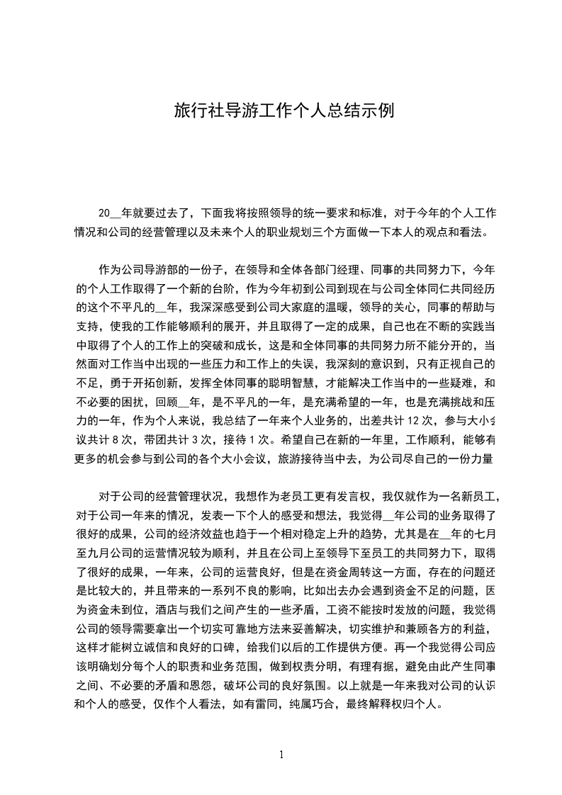 作为公司导游部的一份子,在领导和全体各部门经理、同事的共同努力下,今年的个人工作取得了一个新的台阶,作为今年初到公司到现在与公司全体同仁共同经历的这个不平凡的__年,我深深感受到公司大家庭的温暖,领导的关心,同事的帮助与支持,使我的工作能够顺利的展开,并且取得了一定的成果,自己也在不断的实践当中取得了个人的工作上的突破和成长,这是和全体同事的共同努力所不能分开的,当然面对工作当中出现的一些压力和工作上的失误,我深刻的意识到,只有正视自己的不足,勇于开拓创新,发挥全体同事的聪明智慧,才能解决工作当中的一些疑难,和不必要的困扰,回顾__年,是不平凡的一年,是充满希望的一年,也是充满挑战和压力的一年,作为个人来说,我总结了一年来个人业务的,出差共计12次,参与大小会议共计8次,带团共计3次,接待1次。希望自己在新的一年里,工作顺利,能够有更多的机会参与到公司的各个大小会议,旅游接待当中去,为公司尽自己的一份力量。