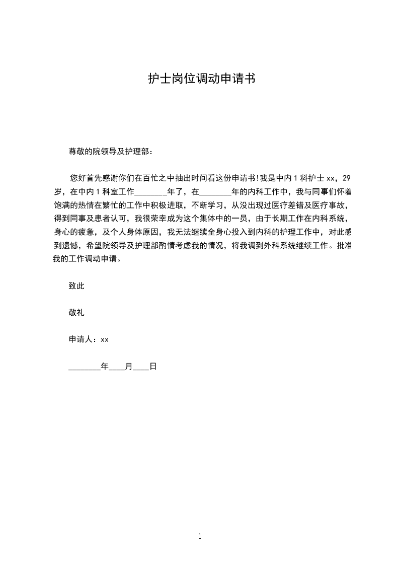 您好首先感谢你们在百忙之中抽出时间看这份申请书!我是中内1科护士xx,29岁,在中内1科室工作________年了,在________年的内科工作中,我与同事们怀着饱满的热情在繁忙的工作中积极进取,不断学习,从没出现过医疗差错及医疗事故,得到同事及患者认可,我很荣幸成为这个集体中的一员,由于长期工作在内科系统,身心的疲惫,及个人身体原因,我无法继续全身心投入到内科的护理工作中,对此感到遗憾,希望院领导及护理部酌情考虑我的情况,将我调到外科系统继续工作。批准我的工作调动申请。