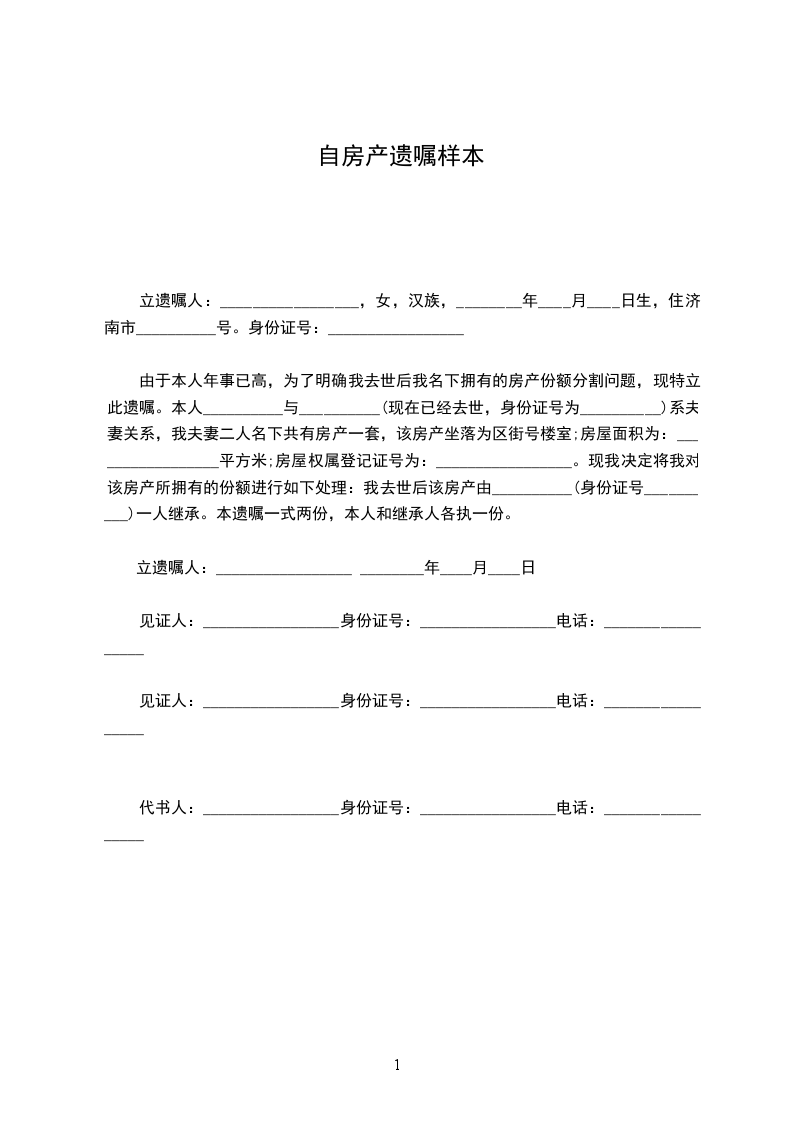 由于本人年事已高,为了明确我去世后我名下拥有的房产份额分割问题,现特立此遗嘱。本人__________与__________(现在已经去世,身份证号为__________)系夫妻关系,我夫妻二人名下共有房产一套,该房产坐落为区街号楼室;房屋面积为:_________________平方米;房屋权属登记证号为:_________________。现我决定将我对该房产所拥有的份额进行如下处理:我去世后该房产由__________(身份证号__________)一人继承。本遗嘱一式两份,本人和继承人各执一份。