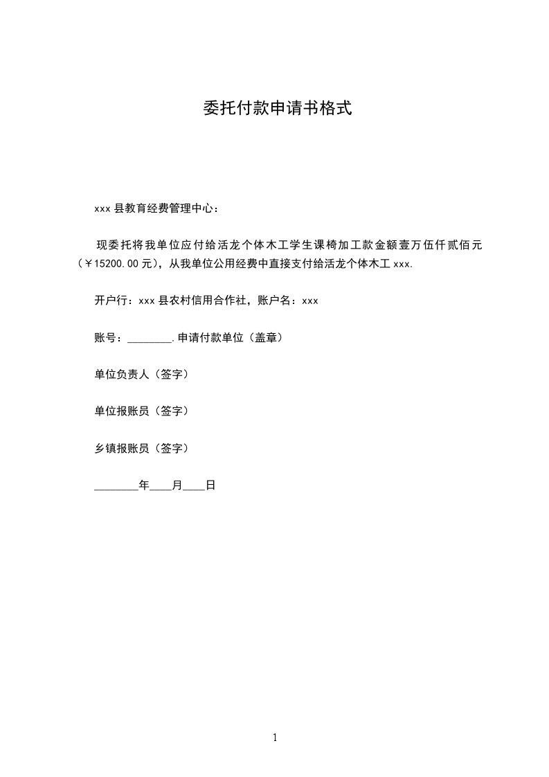 现委托将我单位应付给活龙个体木工学生课椅加工款金额壹万伍仟贰佰元(¥15200.00元),从我单位公用经费中直接支付给活龙个体木工xxx.