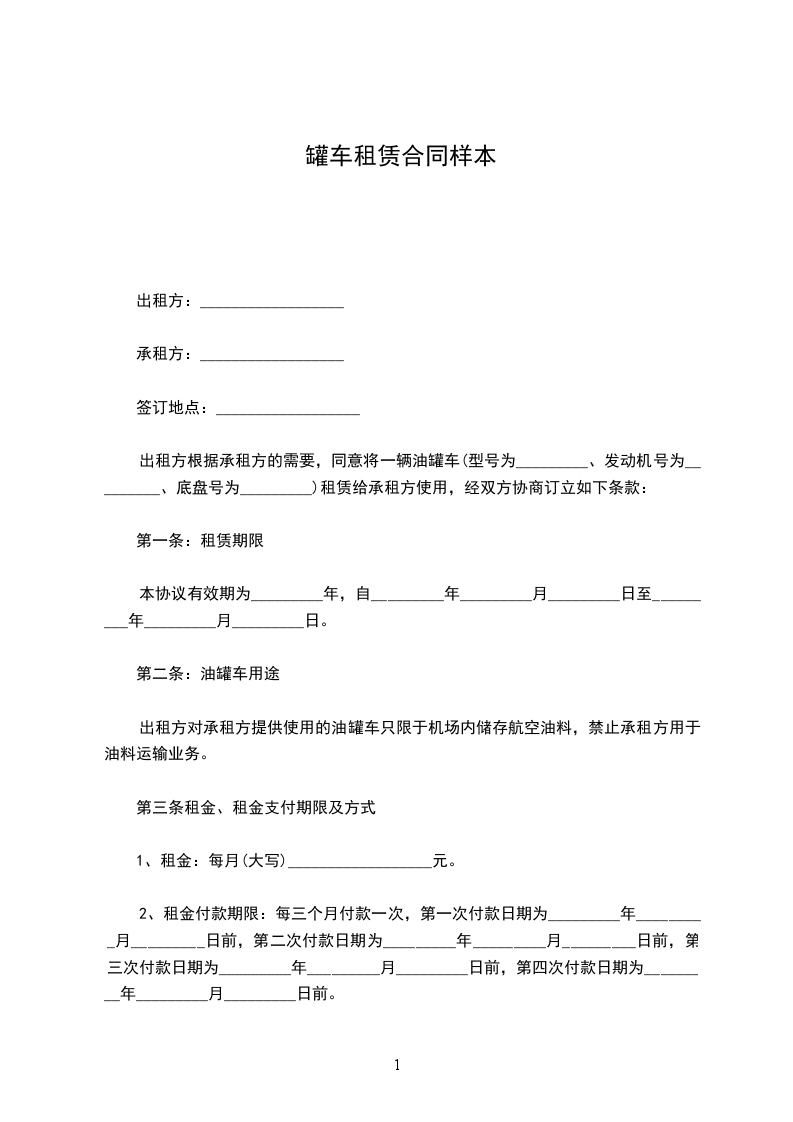 出租方根据承租方的需要,同意将一辆油罐车(型号为_________、发动机号为_________、底盘号为_________)租赁给承租方使用,经双方协商订立如下条款: