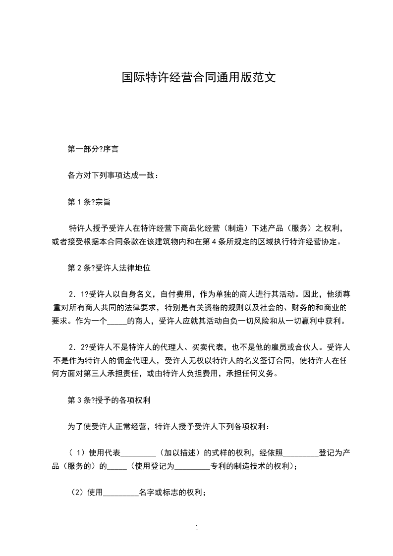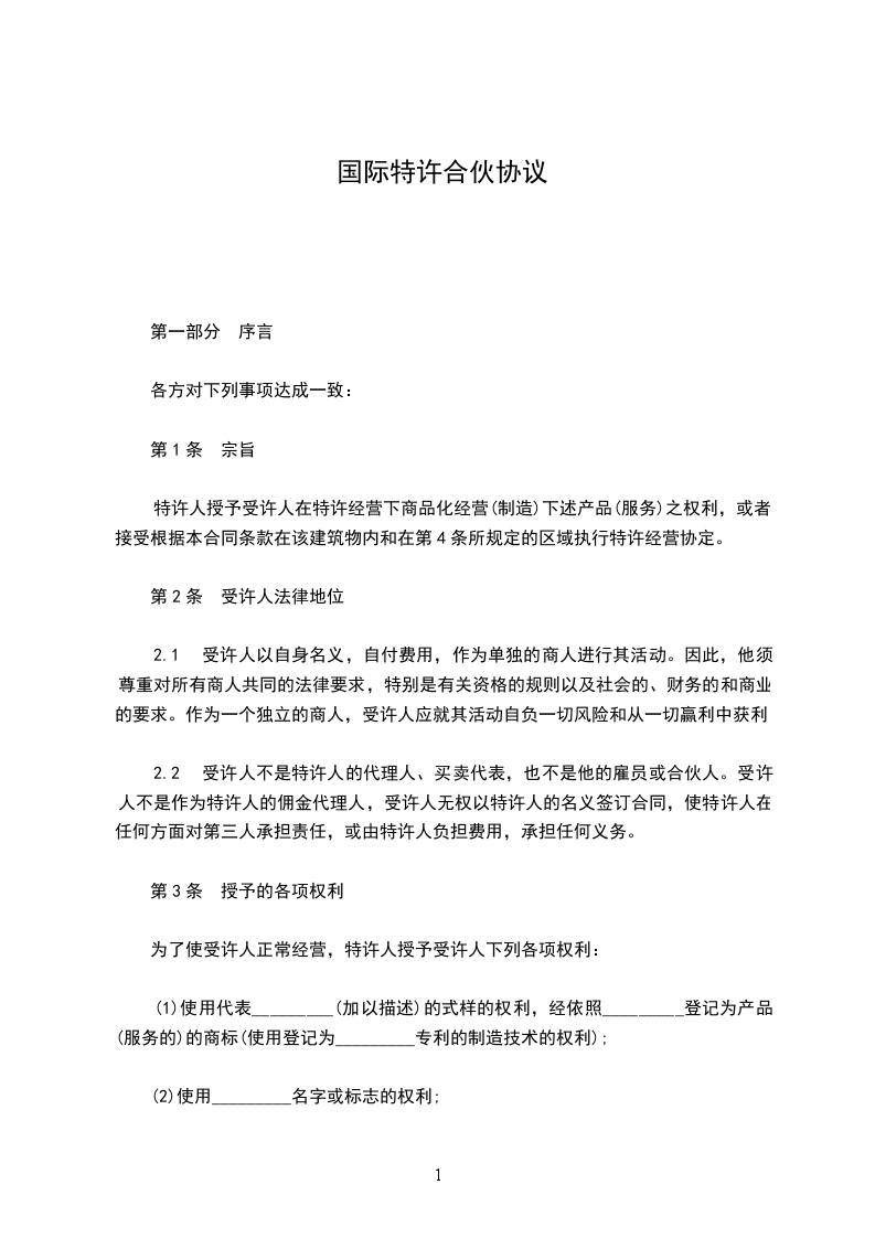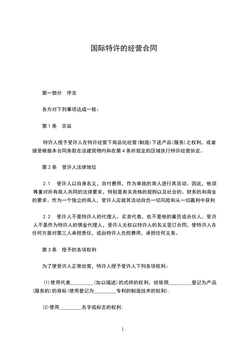 特许人授予受许人在特许经营下商品化经营(制造)下述产品(服务)之权利,或者接受根据本合同条款在该建筑物内和在第4条所规定的区域执行特许经营协定。