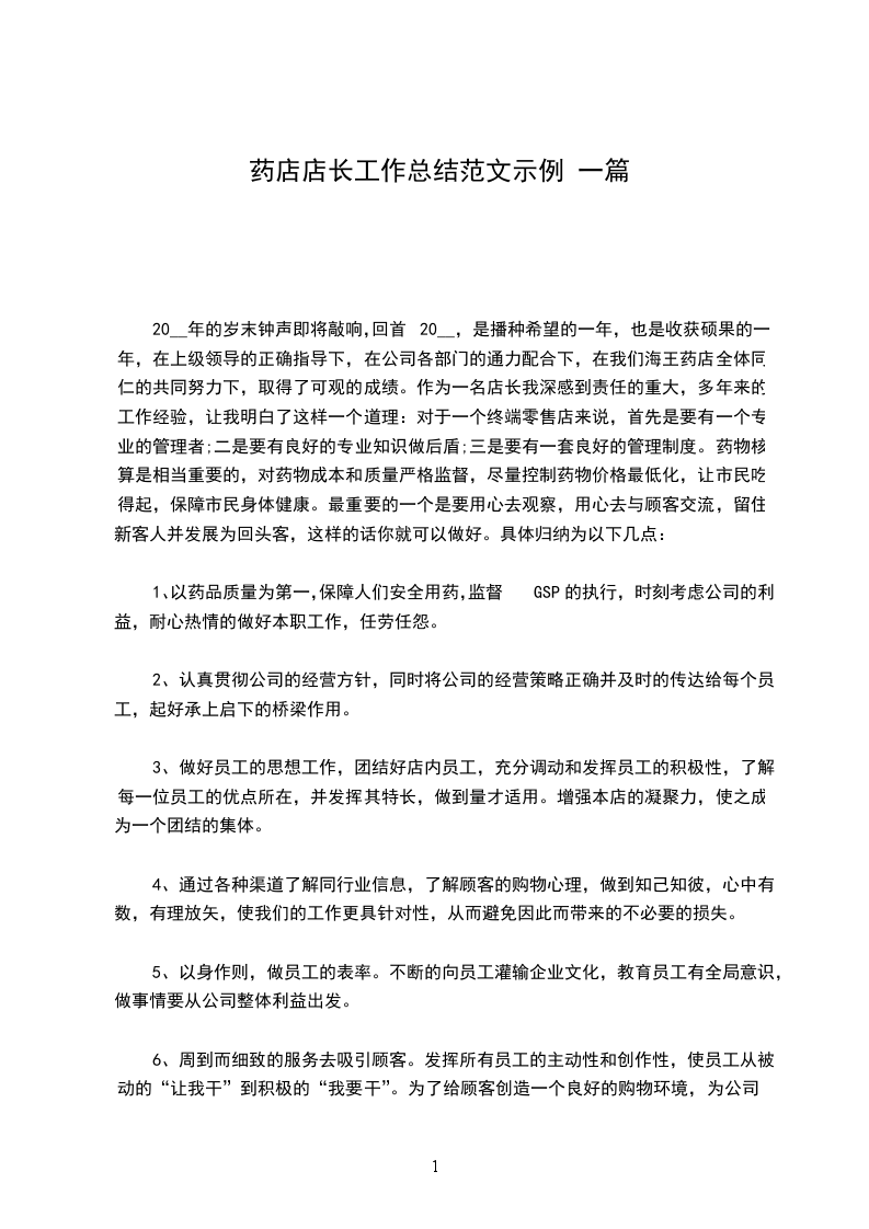 20__年的岁末钟声即将敲响,回首20__,是播种希望的一年,也是收获硕果的一年,在上级领导的正确指导下,在公司各部门的通力配合下,在我们海王药店全体同仁的共同努力下,取得了可观的成绩。作为一名店长我深感到责任的重大,多年来的工作经验,让我明白了这样一个道理:对于一个终端零售店来说,首先是要有一个专业的管理者;二是要有良好的专业知识做后盾;三是要有一套良好的管理制度。药物核算是相当重要的,对药物成本和质量严格监督,尽量控制药物价格最低化,让市民吃得起,保障市民身体健康。最重要的一个是要用心去观察,用心去与顾客交流,留住新客人并发展为回头客,这样的话你就可以做好。具体归纳为以下几点:
