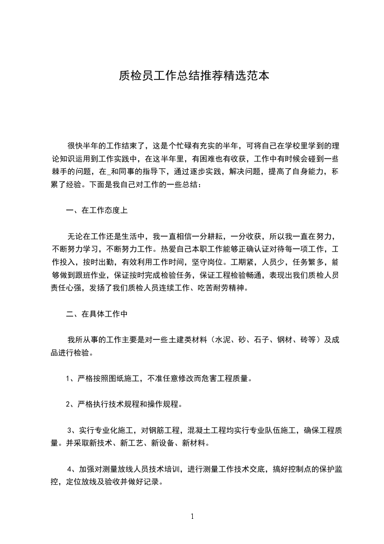 在巫山县第二高级中学项目部担任质检员的四五个月里,该项目地块A1#、A2#楼完成了地上二层及A18#地下车库部分施工任务。我也是在干中学,不断弥补自己施工经验欠缺的弱点。工作上我一直要求自己在施工现场多去看、多去听、多去做、多去想。并且确实学到了不少东西,例如,在主体施工时,钢筋砼柱子钢筋经常容易产生钢筋位移的质量通病,严重影响了工程质量,在最初检查时,因为经验不足,忽视了这个问题,应该在施工时就要注意检查是否绑扎两至三道定位箍筋,柱身是否按要求设置保护层垫块,来保证钢筋的位置。我想经验也就是这样一点一点积攒起来的吧。只要持之以恒,总会有点收获。在这几个月的工作中,不管是公司还是项目部领导对东港第项目都非常重视,尤其是质量方面。徐经理以及技术负责人王工也经常会对我提出中肯的意见和工作上的指导。我虽然切实感受到了做好质检工作的压力,但这种压力也可以说是一种动力,也让我更加确定质检员工作的重要性,明确了发展方向。在工作中我自己会动手去尝试砌砖、压光砼地面、绑扎钢筋等一些实际操作,在实践中去琢磨、体会是什么样的原因以及哪些不当的操作会造成工程质量问题。作为一名专职质检员,我的施工经验确实不是很丰富,这也造成质检工作所必备的预见性能力不强,因此在质量管理上还是有很多欠缺,当然这不是一朝一夕的事情,是长期积累的过程。为了弥补经验上欠缺,第一点就是要熟练掌握规范、图集,工作中,我经常会翻阅验收规范,与现场实际检查相结合,可以更好加深对规范的理解,变成自己的东西,不再去死记硬背。第二点需要提到的就是对图纸的理解,施工过程中施工员和质检员是对图纸理解最深的,作为质检员能理解图纸意图,也是质检工作的前提。工作中,我也会更多地比照图纸,检查现场实际施工情况,加强施工过程控制,及时发现问题。第三点还要提到的就是施工日记的记录,施工日记是对每日施工情况的如实记录,是非常好的累积经验的手段,通过质量检查记录,可以总结这个工程中经常会出现的质量通病,为今后工作中的预防及检查工作提供了依据。以上三点是我作为质检员遵循的工作方法,也切实改变了一些一直存在的问题,自身能力也有所提高。