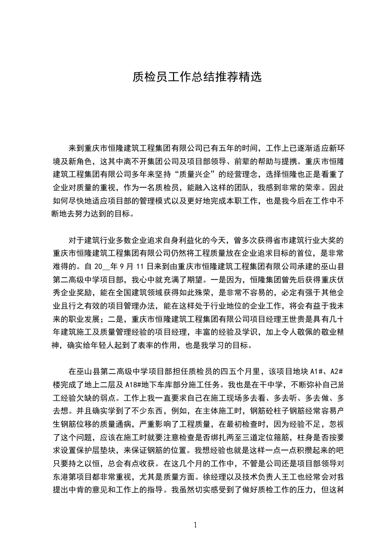 来到重庆市恒隆建筑工程集团有限公司已有五年的时间,工作上已逐渐适应新环境及新角色,这其中离不开集团公司及项目部领导、前辈的帮助与提携。重庆市恒隆建筑工程集团有限公司多年来坚持“质量兴企”的经营理念,选择恒隆也正是看重了企业对质量的重视,作为一名质检员,能融入这样的团队,我感到非常的荣幸。因此如何尽快地适应项目部的管理模式以及更好地完成本职工作,也是我今后在工作中不断地去努力达到的目标。