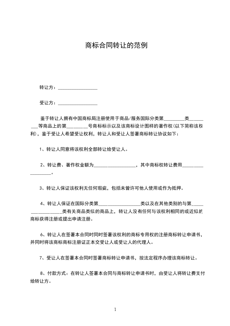 8、付款方式:在转让人签署本合同与商标转让申请书时,由受让人将转让费支付给转让方。