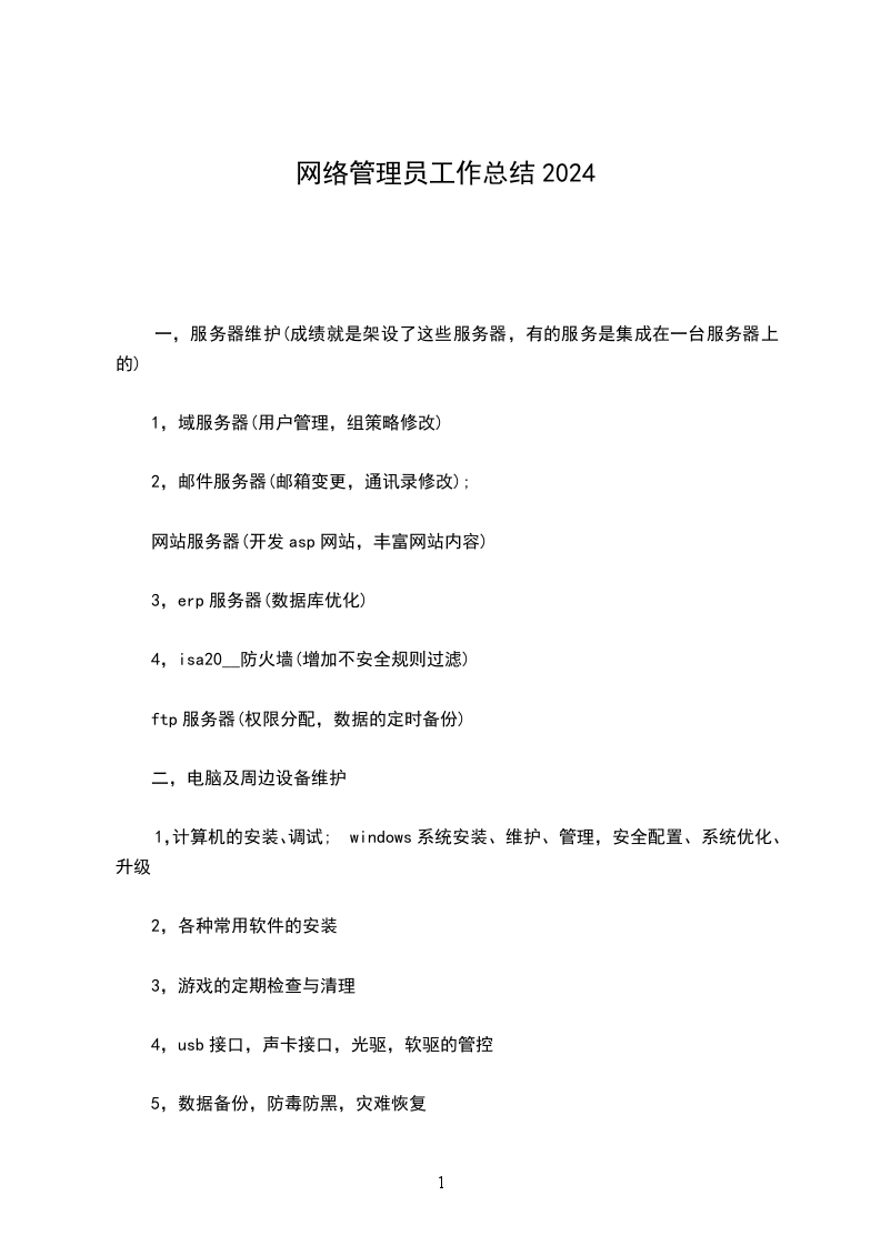 6,周边设备(如:打印机、传真机)的维护、维修,网络管理员工作计划。