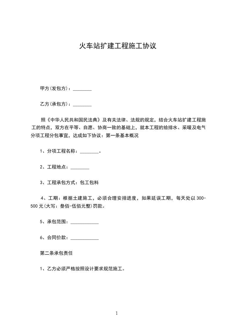 依照《中华人民共和国民法典》及有关法律、法规的规定,结合火车站扩建工程施工的特点,双方在平等、自愿、协商一致的基础上,就本工程的给排水、采暖及电气分项工程分包事宜,达成如下协议: