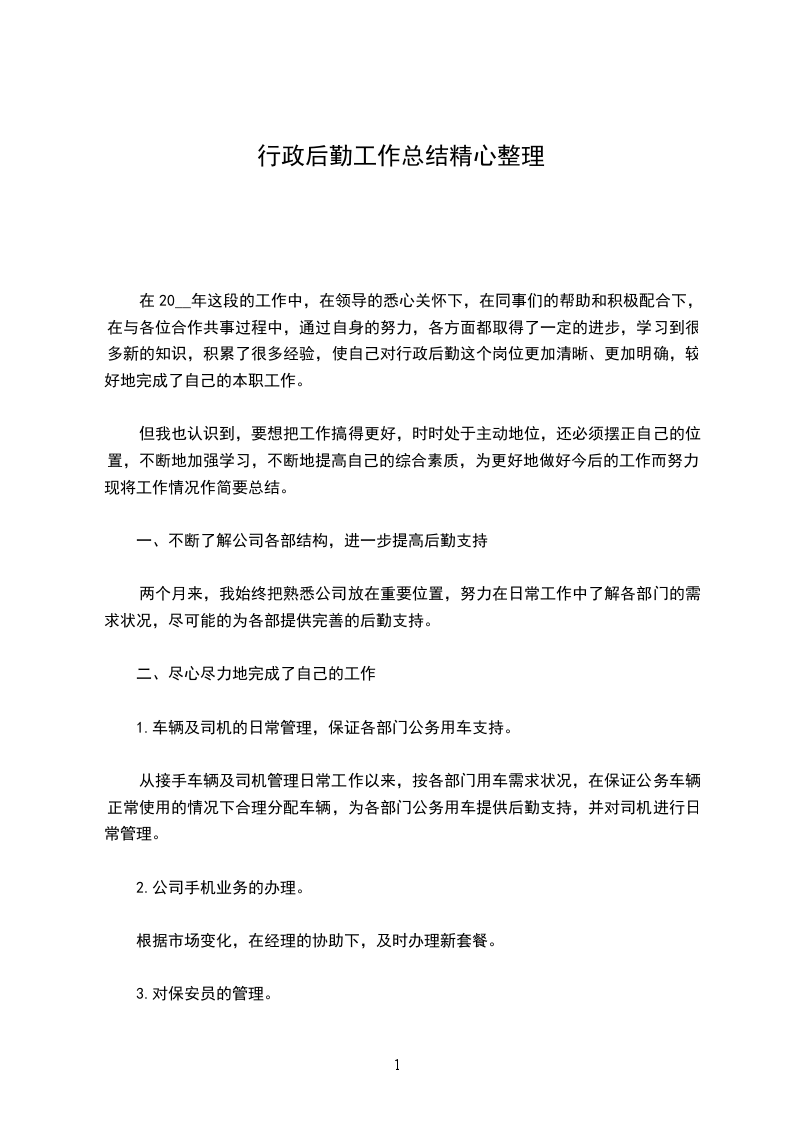 在20__年这段的工作中,在领导的悉心关怀下,在同事们的帮助和积极配合下,在与各位合作共事过程中,通过自身的努力,各方面都取得了一定的进步,学习到很多新的知识,积累了很多经验,使自己对行政后勤这个岗位更加清晰、更加明确,较好地完成了自己的本职工作。