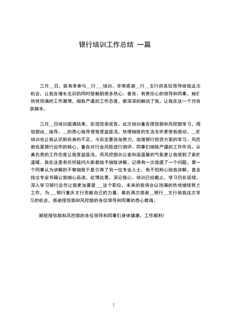三月__日,我有幸参与__行___培训。非常感谢__行__支行的各位领导给我这次机会,让我在增长见识的同时接触到很多热心、善良、有责任心的领导和同事,她们热忱饱满的工作激情,细致严谨的工作态度,都深深的触动了我,让我在这一个月收获颇丰。
