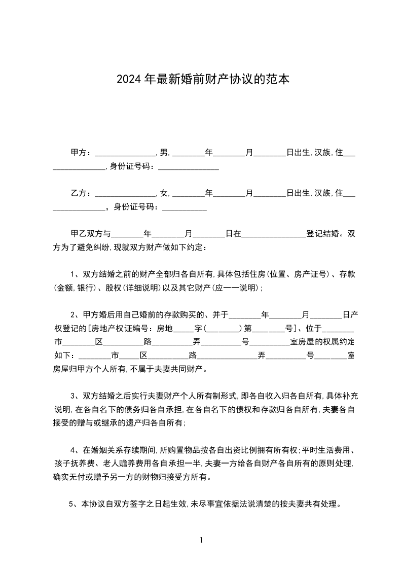 1、双方结婚之前的财产全部归各自所有,具体包括住房(位置、房产证号)、存款(金额,银行)、股权(详细说明)以及其它财产(应一一说明);