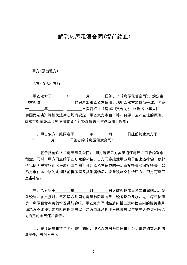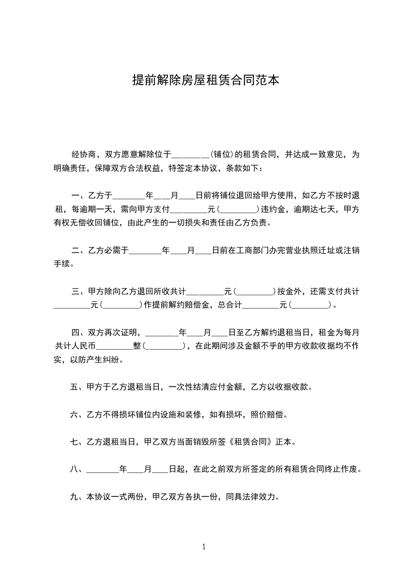 经协商,双方愿意解除位于_________(铺位)的租赁合同,并达成一致意见,为明确责任,保障双方合法权益,特签定本协议,条款如下: