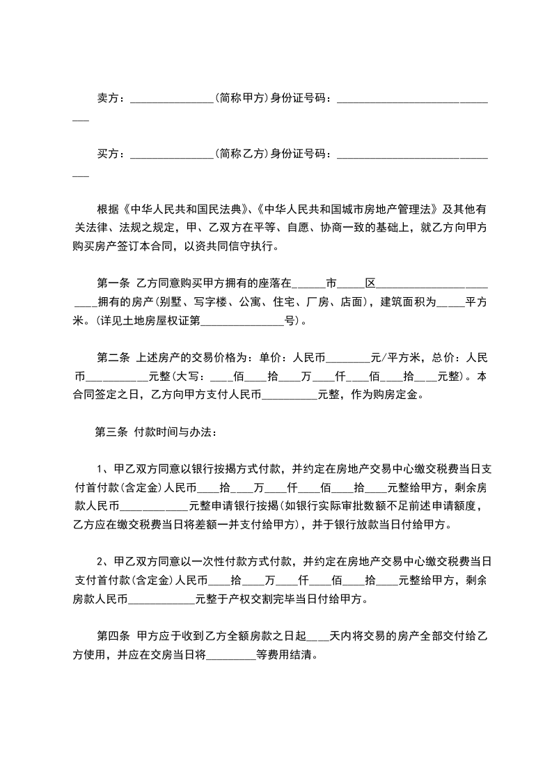 二、该房成交价为人民币_______________元整(小写:_________________元整),一次性付清。