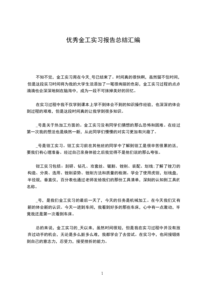 总的来说,金工实习的_天以来,虽然时间很短,但是我在实习过程中并没有放弃过动手的机会,无论是多么脏多么难,我都学会了去尝试。在实习中,也间接锻炼到自己的意志力,忍受力,接受挫折的能力。