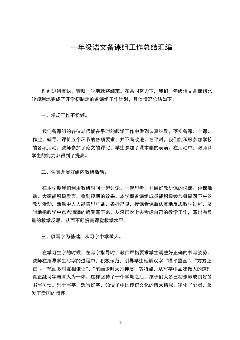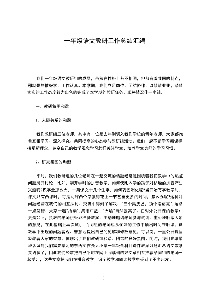 我们一年级语文教研组的成员,虽然在性格上各不相同,但都有着共同的特点,那就是热情好学,工作认真。本学期,我们立足岗位,团结协作,以兢兢业业,踏踏实实的工作态度较为出色的完成了本学期的教研任务。现将情况作一小结。