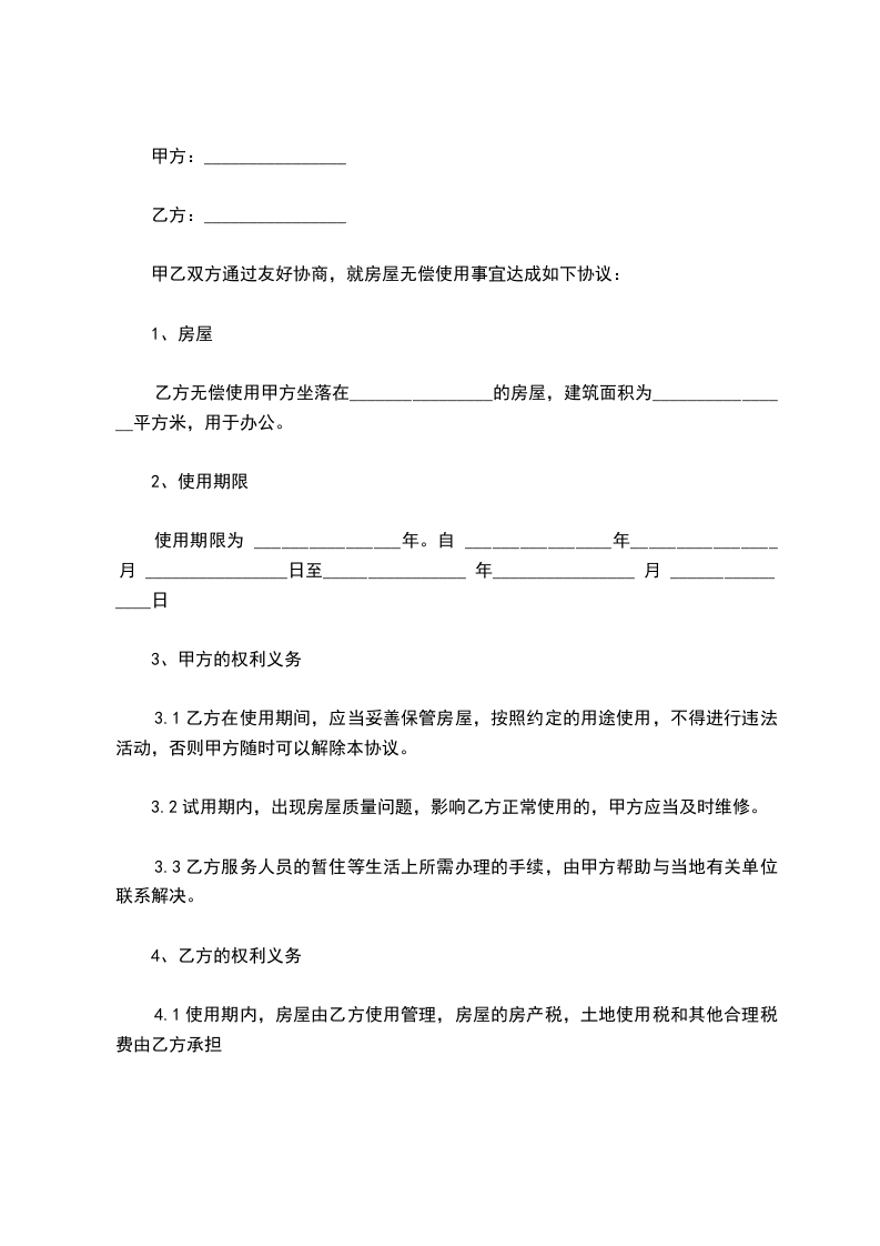 乙方无偿使用甲方坐落在________________的房屋,建筑面积为________________平方米,用于办公。