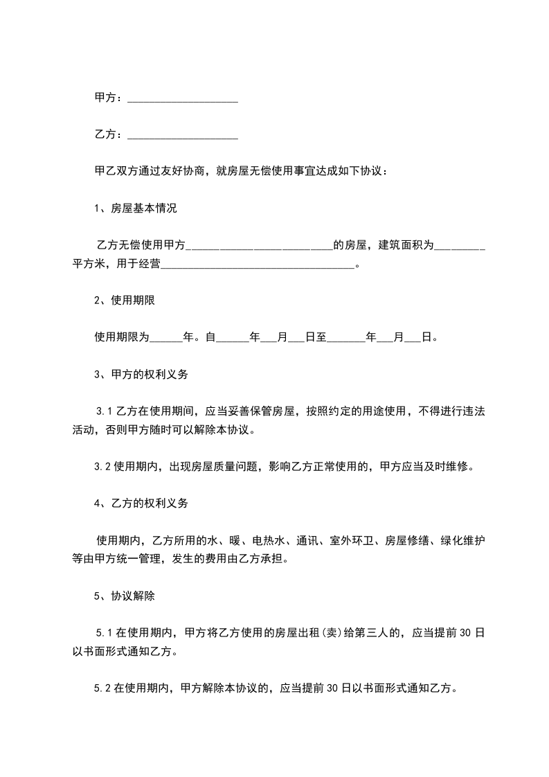 甲乙双方通过友好协商,就房屋无偿使用事宜达成如下协议: