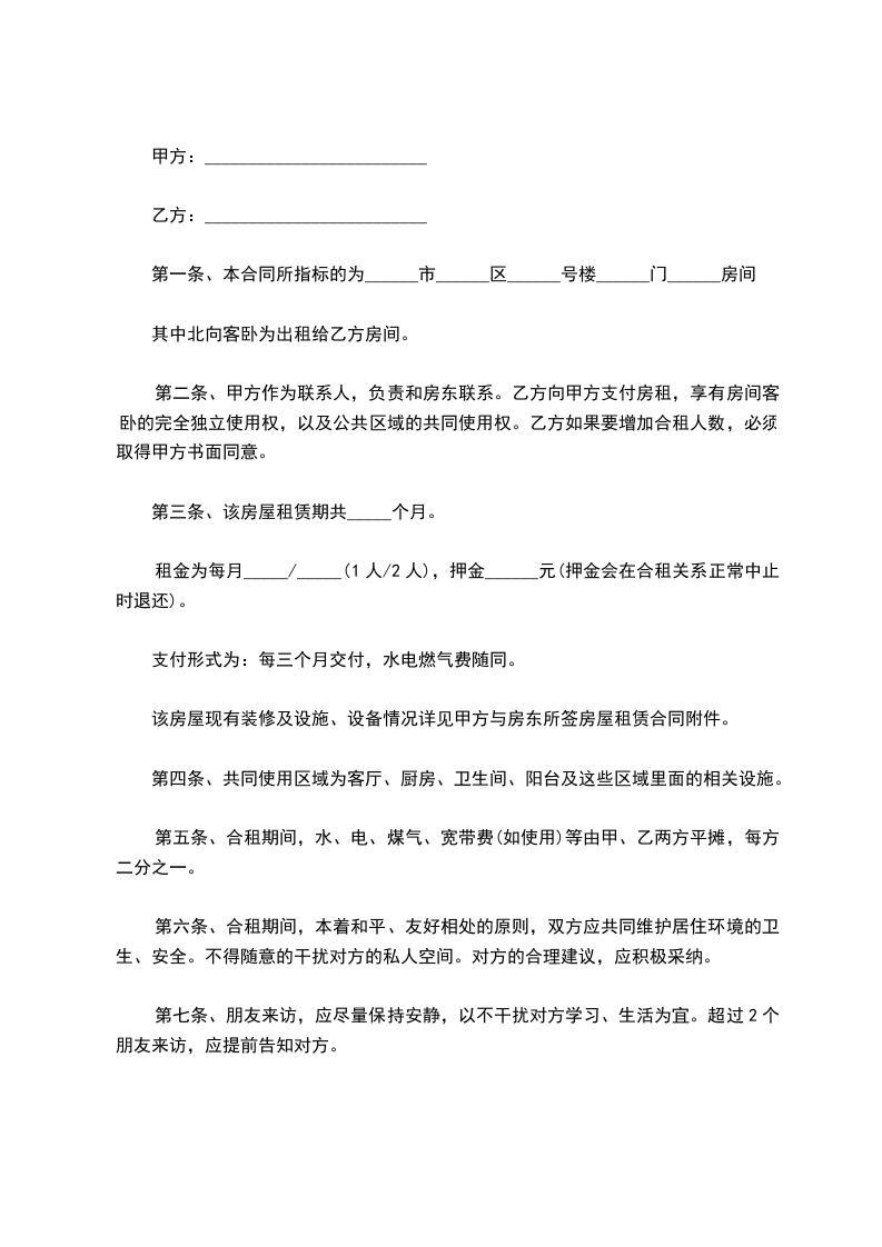 第六条、合租期间,本着和平、友好相处的原则,双方应共同维护居住环境的卫生、安全。不得随意的干扰对方的私人空间。对方的合理建议,应积极采纳。