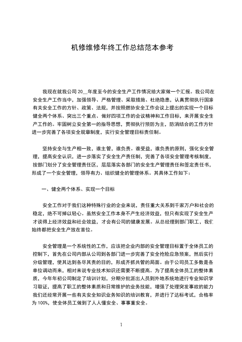 机修维修年终工作总结范本参考